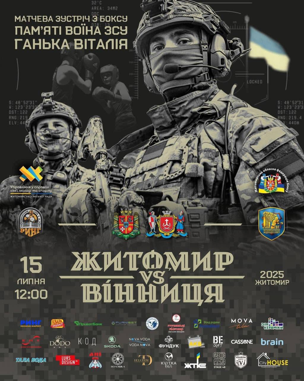 Присвячено памʼяті воїна ЗСУ Віталія Ганька. У програмі — 15 поєдинків між командами Житомира та Вінниці за участі спортсменів різного віку та вагових категорій.