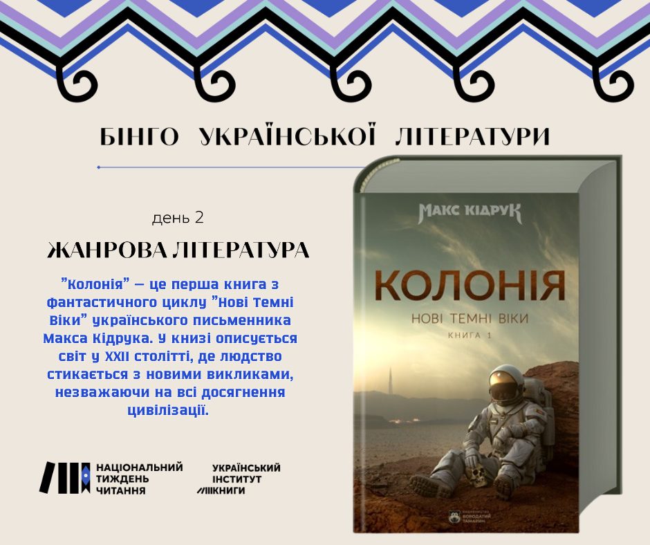 📜 Одним із прикладів сучасної української прози є творчість Макса Кідрука. Радимо звернути увагу на його роман «Колонія» – першу частину епопеї «Нові Темні Віки». Події розгортаються у XXII столітті, де людство стикається з екологічними катастрофами, пандеміями, сигналами з космосу і викликами на Марсі. Це – на тлі філософських роздумів про майбутнє.
