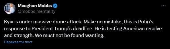 Меган Моббс, донька спецпредставника президента США Дональда Трампа Кіта Келлога, заявила, що масована нічна атака Росії на Київ у ніч проти 31 липня 2025 року є прямою реакцією Кремля на дедлайн, встановлений американським лідером. Про це вона написала у своїй публікації в соцмережах.