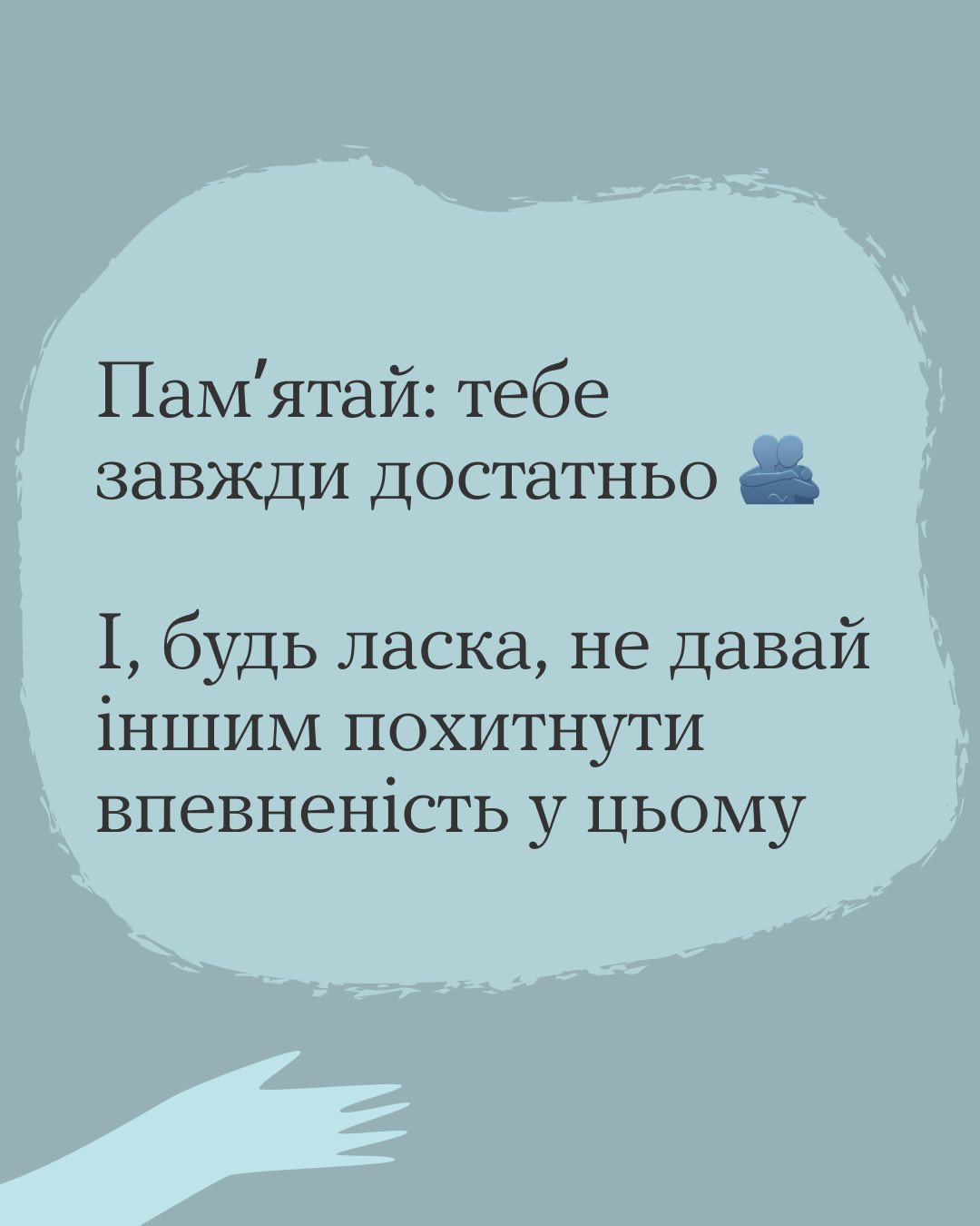 Поділіться в коментарях, чи знайоме вам відчуття «ти недостатній», щоб інші побачили, що вони не самотні у своїх переживаннях. Підтримка та розуміння можуть допомогти нам прийняти себе такими, якими ми є, і повірити у власне «достатньо». Давайте разом створимо простір, де кожен відчуває себе цінним і важливим. Адже кожен з нас заслуговує на те, щоб відчувати себе достатнім.