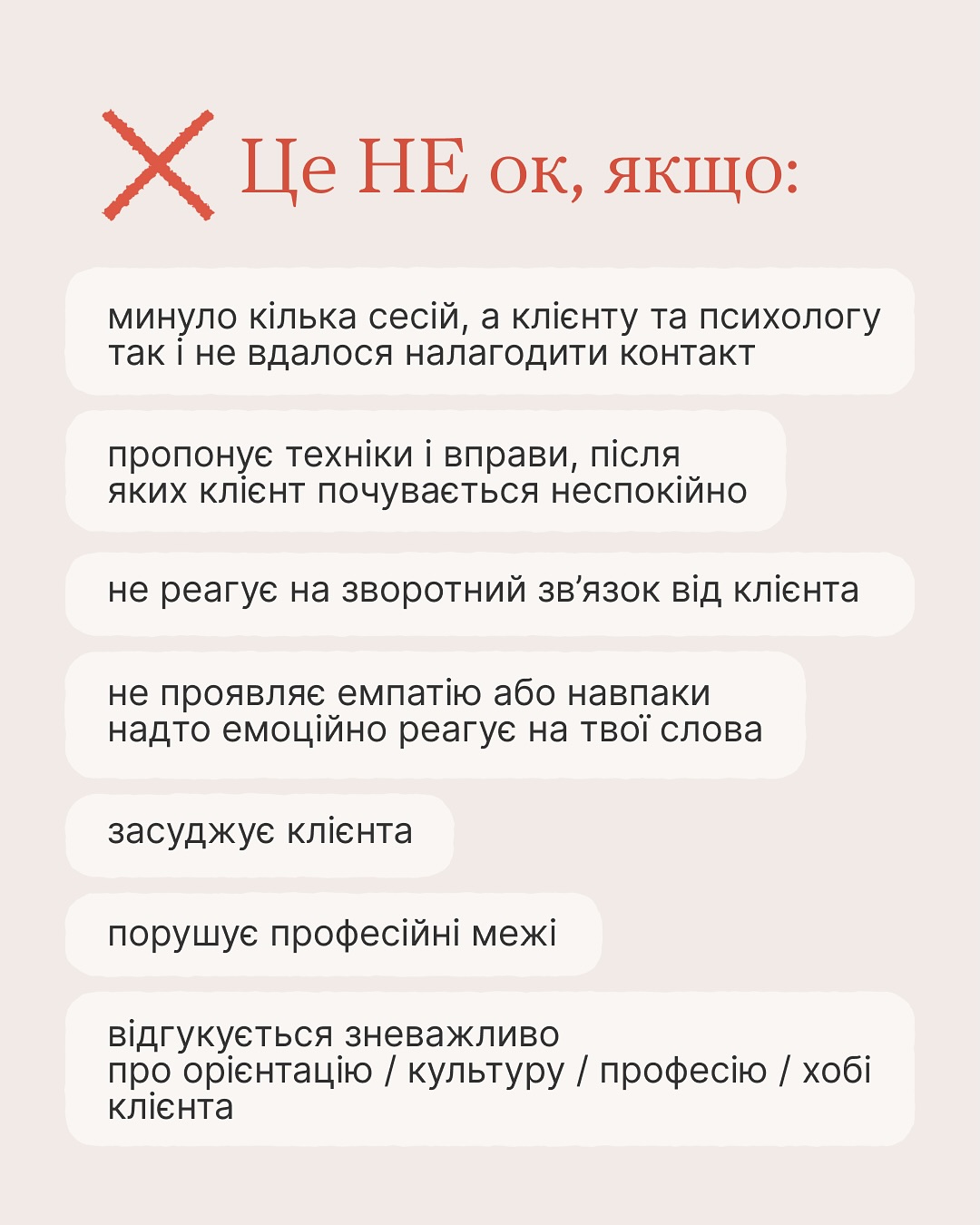 Якщо ви маєте досвід роботи з психологами, поділіться в коментарях своїми «НЕ». Це може бути корисно для інших користувачів, які шукають допомоги. Ваші історії та поради можуть стати цінним орієнтиром у виборі кваліфікованого фахівця.