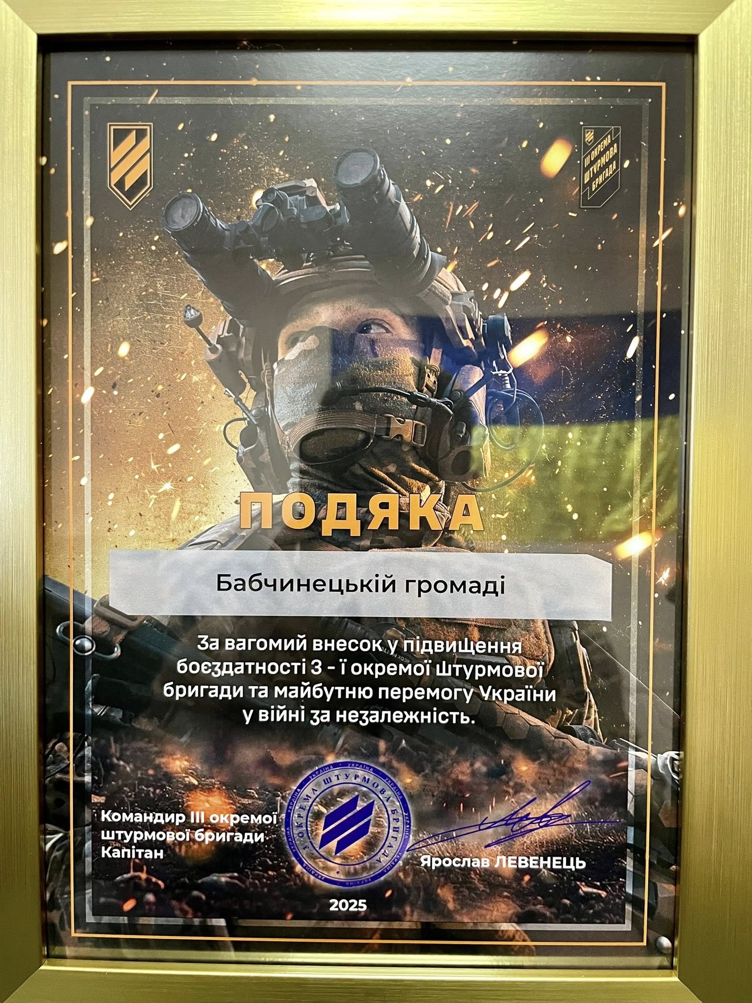 Бабчинецька сільська територіальна громада з гордістю отримала подяку від ІІІ окремої штурмової бригади. Ця відзнака є вираженням глибокої вдячності за незламну підтримку та неоціненну допомогу, яку громада надає нашим захисникам. Ми розглядаємо це як велику честь і водночас як важливе нагадування про те, що наша сила полягає в єдності. Разом ми здатні подолати будь-які виклики.
