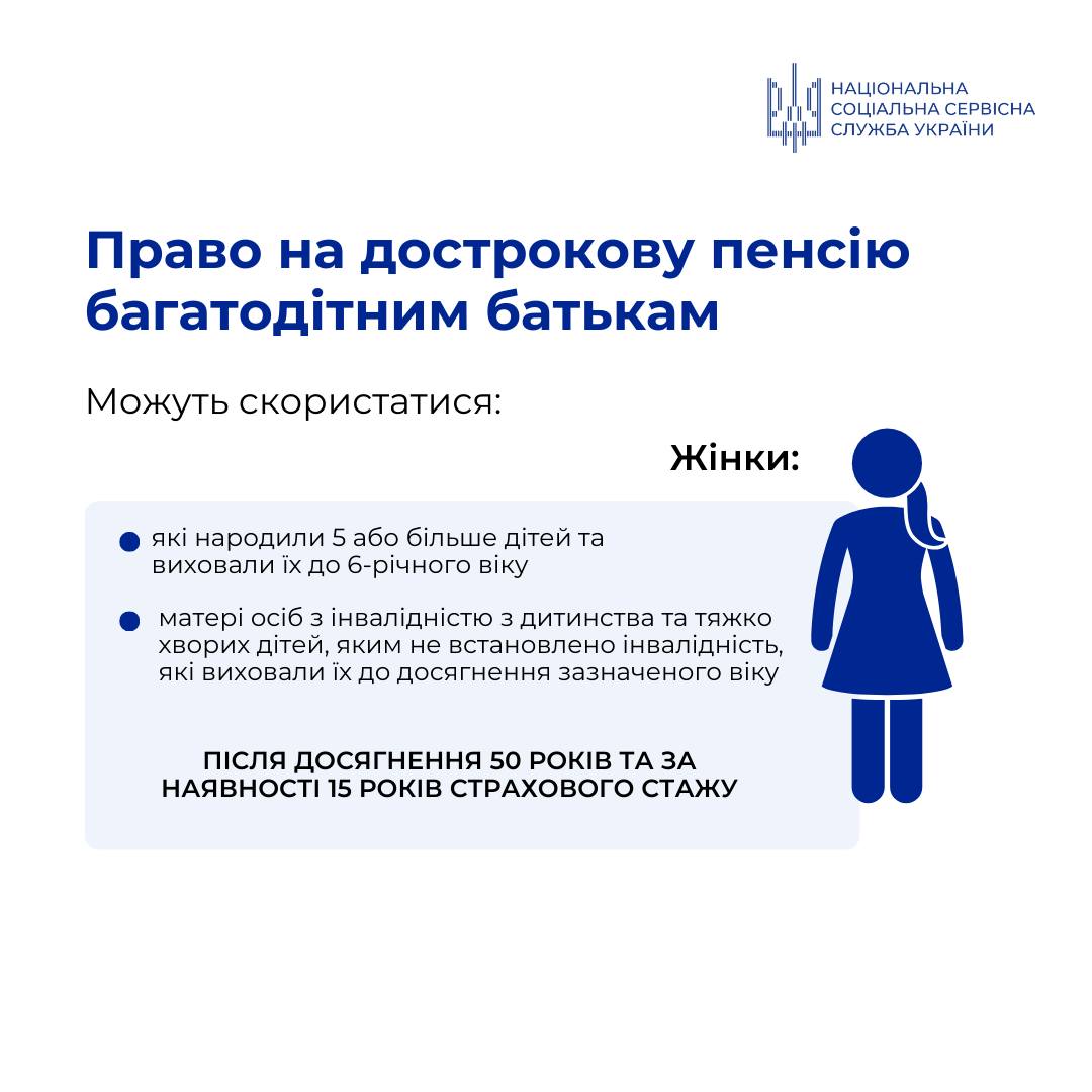 ☑ Важливо знати, що дострокова пенсія для жінок, які відповідають зазначеним критеріям, передбачена з 50 років. Для цього необхідно мати щонайменше 15 років страхового стажу. Для чоловіків, які виховують п’ятьох або більше дітей, пенсійний вік становить 55 років, за умови наявності не менше 20 років страхового стажу.