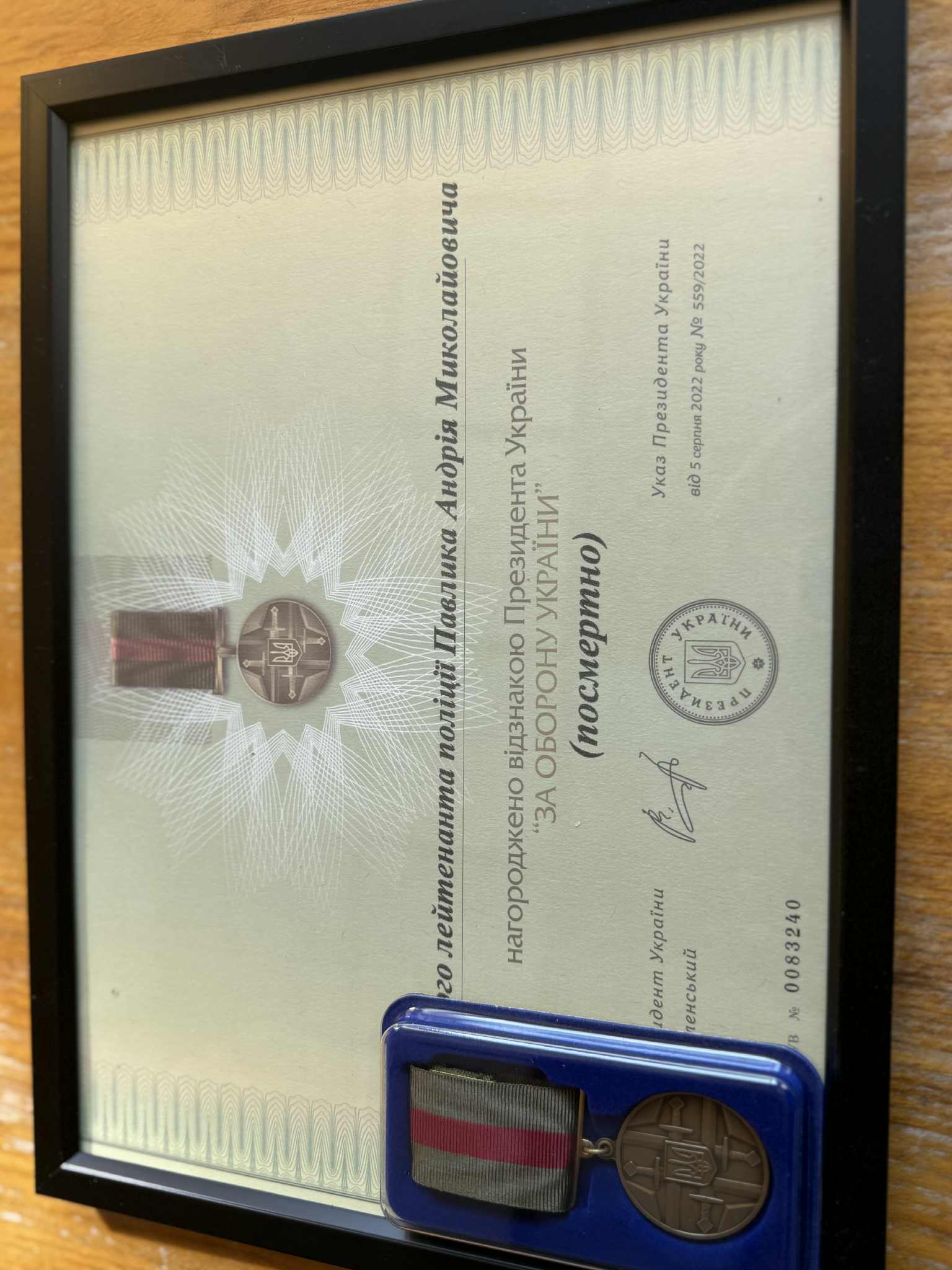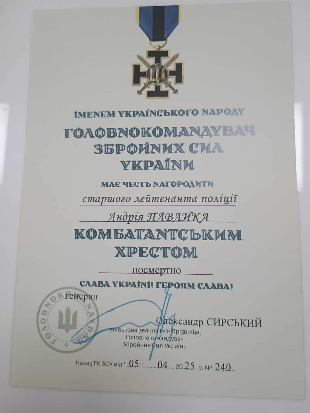 Батьки Андрія Павлика, поліцейського з Львівщини, який героїчно загинув у боротьбі за Україну, отримали посмертні нагороди свого сина. Старший лейтенант поліції Андрій Павлик, що служив у штурмовому полку «Сафарі», посмертно відзначений Президентом України «За оборону України» та нагрудним знаком Головнокомандувача ЗСУ «Комбатантський хрест». Ці високі нагороди вручені за його особисту мужність та самовідданість, виявлені під час захисту нашої держави.