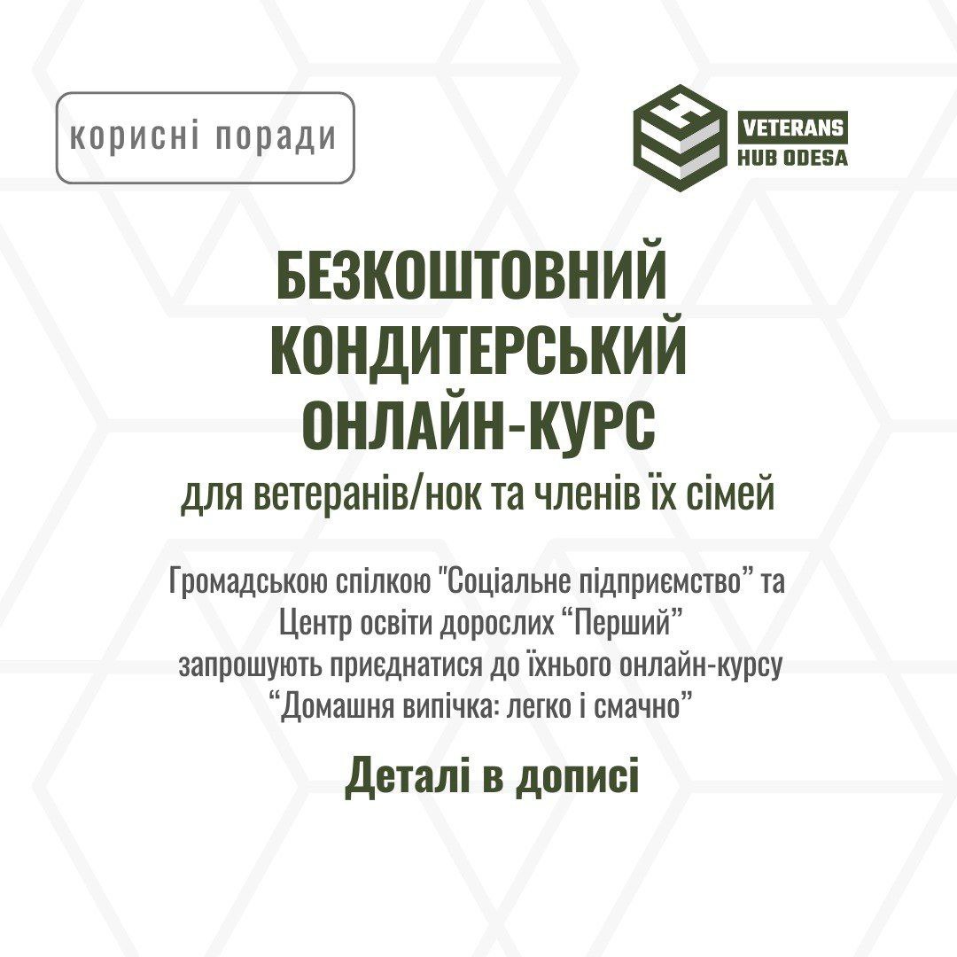 🔰 Громадська спілка “Соціальне підприємство” спільно з Центром освіти дорослих “Перший” з гордістю запрошують ветеранів та членів їхніх сімей до унікального онлайн-курсу “Домашня випічка: легко і смачно”. Ця ініціатива спрямована на підтримку тих, хто захищав нашу країну, надаючи їм нові можливості для розвитку та самореалізації. Курс відкритий для всіх, незалежно від попереднього досвіду у кондитерській справі – чи ви новачок, чи вже маєте певні навички, ви знайдете для себе багато цінного. Наш курс “Домашня випічка: легко і смачно” це чудова нагода для ветеранів отримати нові знання та навички.