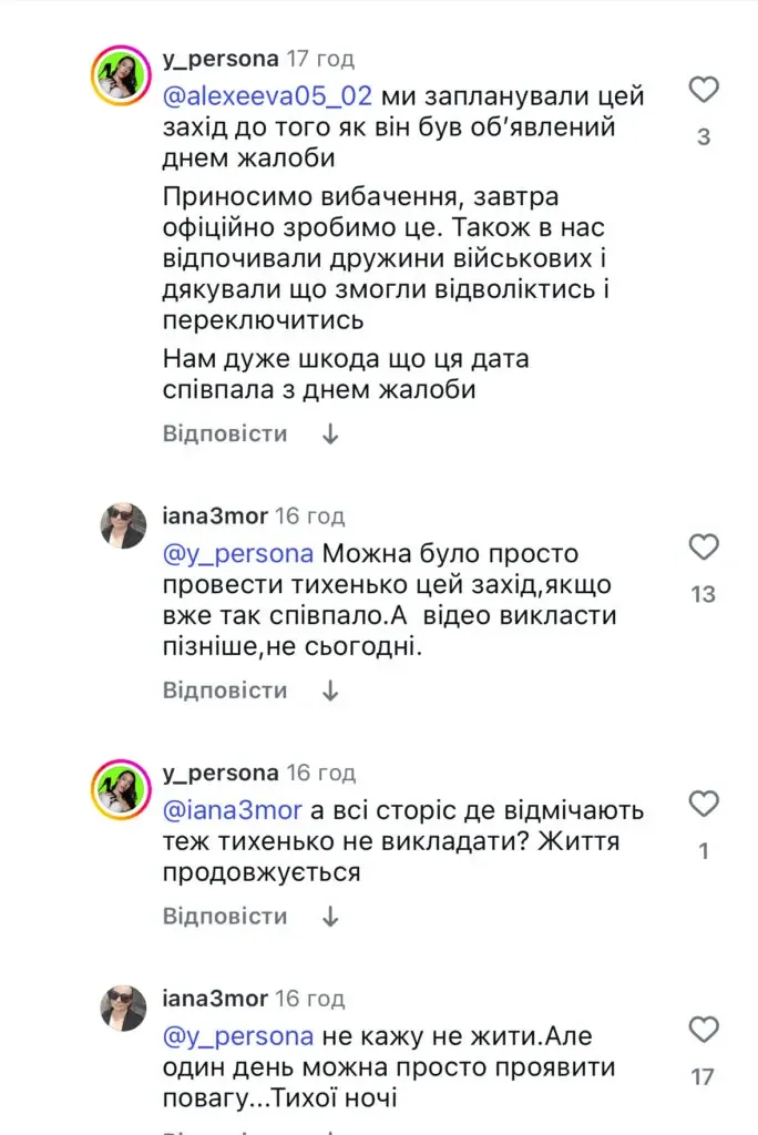 Пізніше організатори вибачилися та написали, що вечірка була запланована заздалегідь, ще до того, як 29 серпня було оголошено днем жалоби в деяких регіонах. Хоча цього дня був ще й загальнонаціональний День пам’яті захисників та захисниць України, який встановлено указом президента ще від 2019 року. Це свідчить про відсутність поваги до пам’яті загиблих.