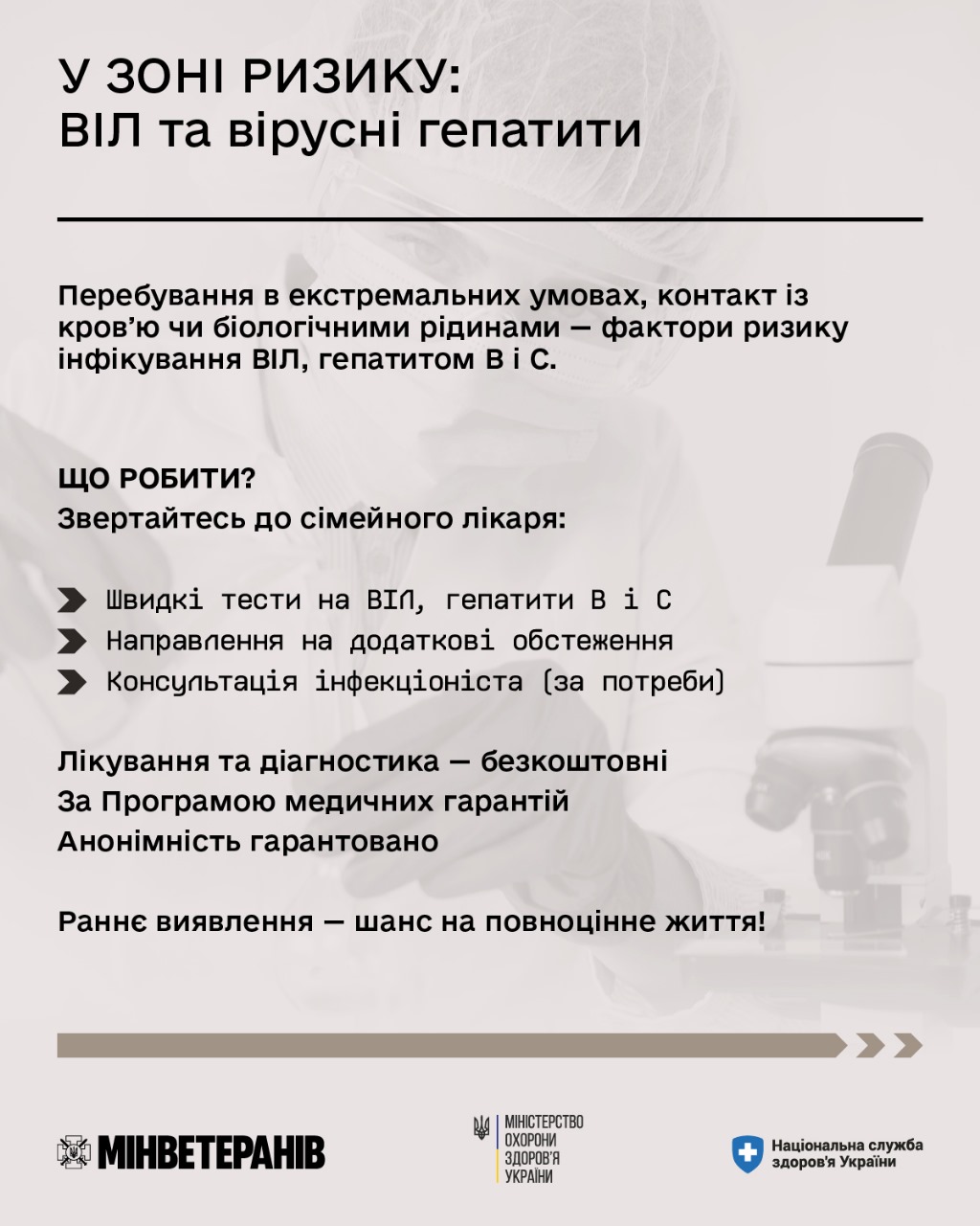 Контакт з кров’ю або перебування в зоні бойових дій значно підвищує ризик інфікування. Не зволікайте, зверніться до свого сімейного лікаря! Швидке тестування, професійна консультація інфекціоніста та необхідне лікування – все це абсолютно безкоштовно за Програмою медичних гарантій.
