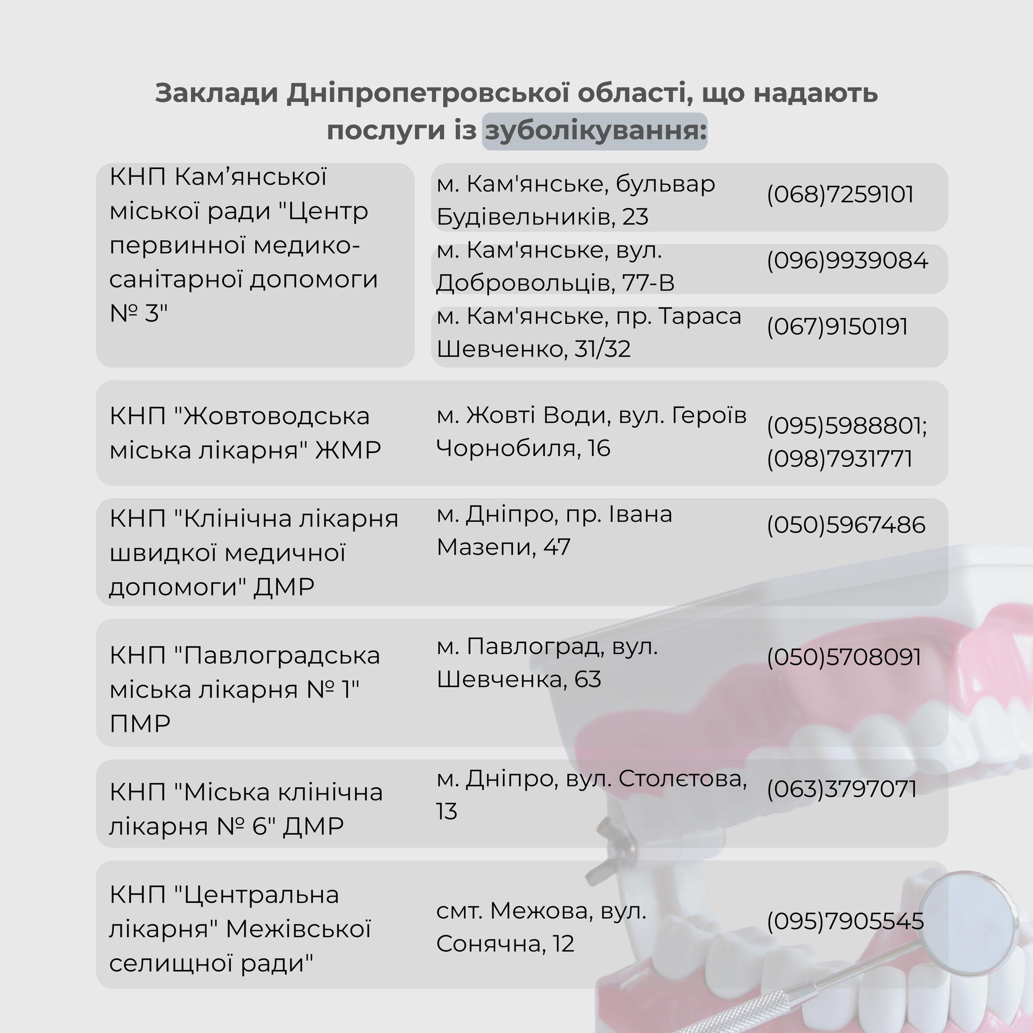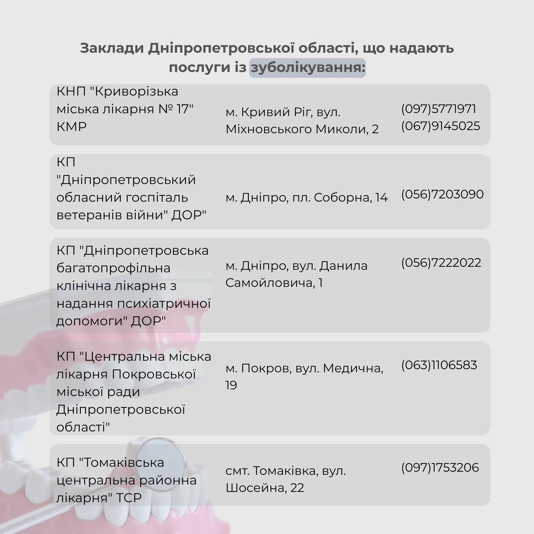 📍 Для зручності наших героїв, перелік медичних закладів у Дніпропетровській області, де можна отримати медичні послуги із зубопротезування або зуболікування безоплатно, представлено на зображеннях. Ми розуміємо, наскільки важливим є своєчасний доступ до кваліфікованої стоматологічної допомоги, тому публікуємо цю інформацію для максимального поширення. Ця ініціатива є частиною ширшої програми підтримки ветеранів та військовослужбовців, яка включає різноманітні соціальні та медичні послуги. Турбота про здоров’я наших захисників – це пріоритет.