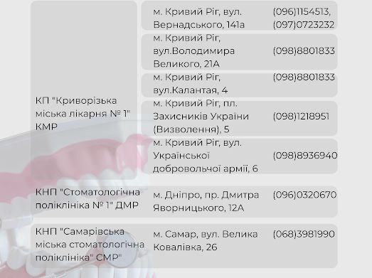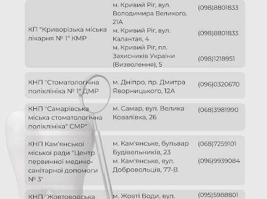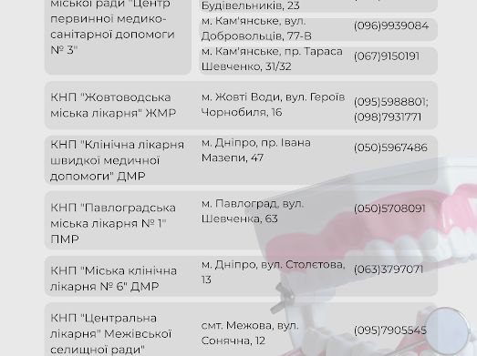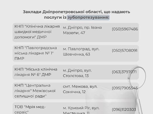 Для мешканців Дніпропетровської області доступний перелік медичних закладів, де можна скористатися безоплатними послугами із зубопротезування та зуболікування. Цей перелік представлений на зображеннях, доданих до цієї публікації. Важливо ознайомитися з цими матеріалами, щоб знайти найближчий до вас заклад та записатися на прийом.