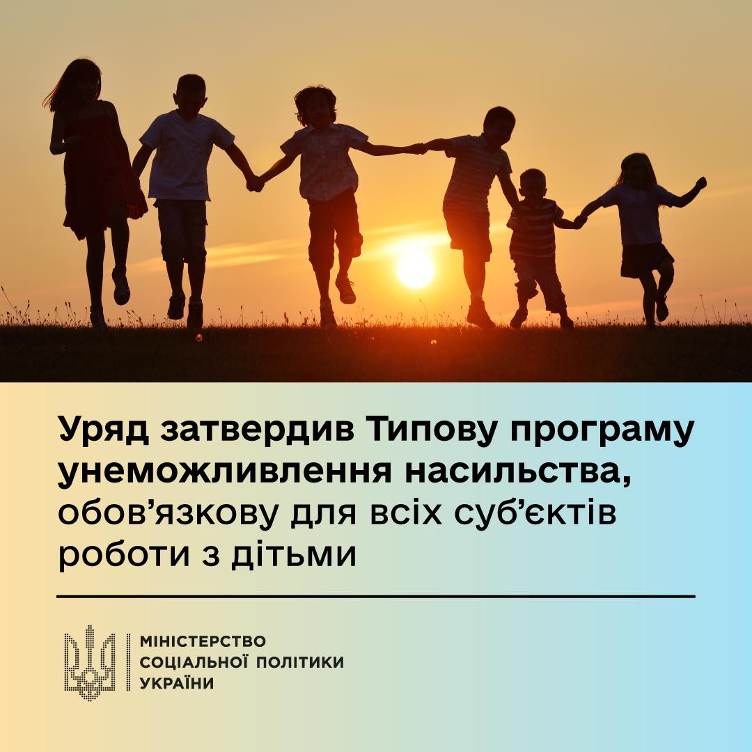 Безпечне середовище для дітей: Новий стандарт для всіх, хто працює з дітьми. Уряд України затвердив важливу ініціативу, розроблену Мінсоцполітики, – Типову програму унеможливлення насильства та жорстокого поводження з дітьми. Цей документ є обов’язковим для впровадження у всіх закладах, які працюють з дітьми та молоддю, включаючи заклади освіти, культури, охорони здоров’я, фізкультури і спорту, оздоровлення і відпочинку, соціального захисту та молодіжні центри.