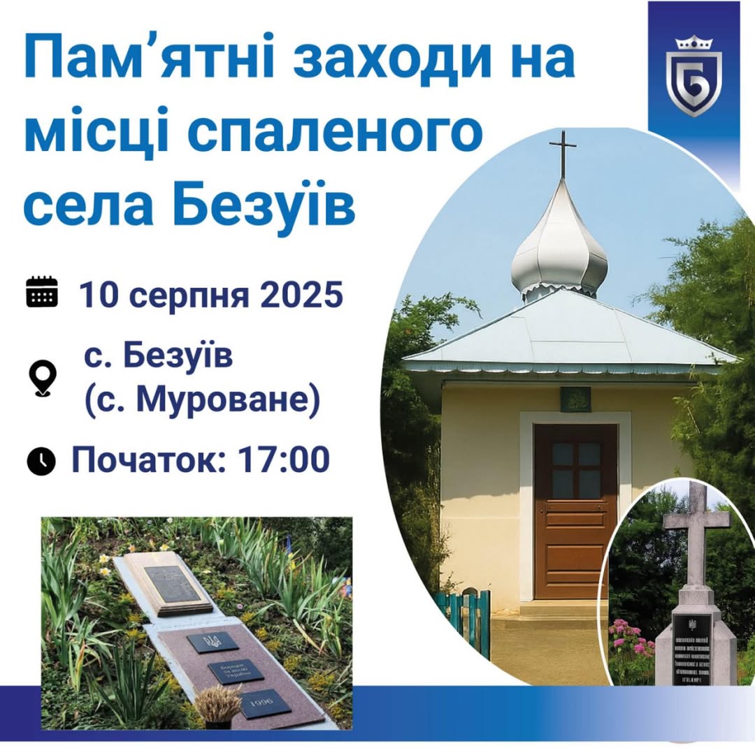Белзька міська рада запрошує мешканців громади та гостей долучитися до пам’ятного заходу, який відбудеться в неділю, 10 серпня 2025 року, на місці спаленого села Безуїв (с. Муроване).