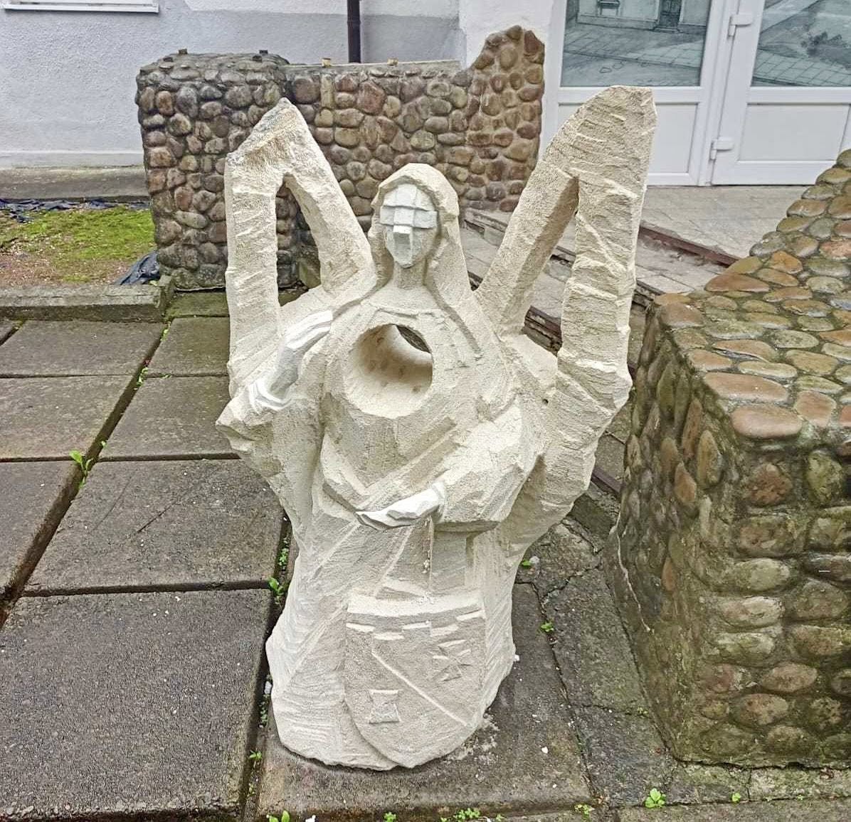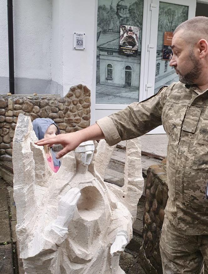 🪽 Основою для «Берегині відродження» стала брила вапняка, знайдена на місці дислокації його батальйону. Використовуючи лише сокиру, Мирослав зумів втілити образ ляльки-мотанки – символу берегині роду. Скульптура прикрашена крилами у формі тризуба. Одне крило має невелике пошкодження, що символізує триваючу боротьбу, біль та жертовність України. На скульптурі також вигравіювано шеврон інженерного батальйону. Для досягнення такого результату Мирослав обробив близько 200 кілограмів зайвого матеріалу.