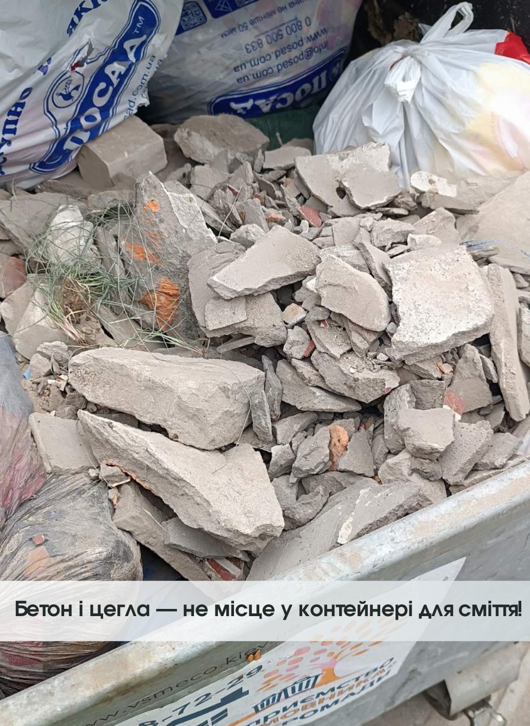 🧱 Бетон, цегла та інші будівельні матеріали — це не те, що має опинятися у контейнерах для побутових відходів! Друзі, давайте разом подбаємо про чистоту нашої громади та дотримаємося простих правил. Контейнери, призначені для збору звичайного сміття, абсолютно не розраховані на будівельні відходи. Такі матеріали, як бетон, цегла, керамічна плитка, залишки штукатурки чи будь-які інші важкі елементи, створюють значне додаткове навантаження.