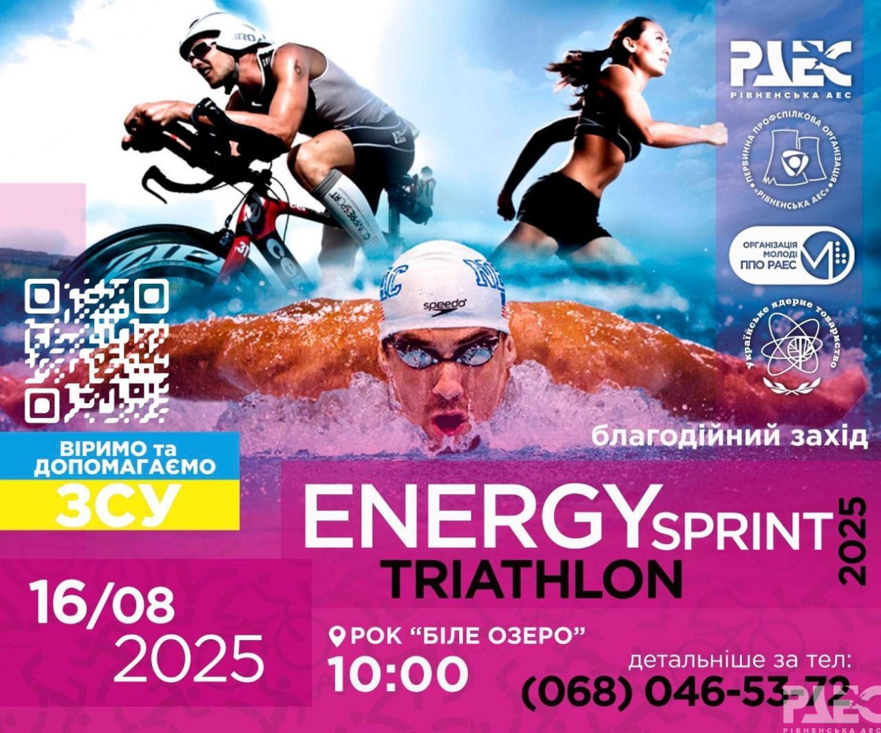 Відкритий благодійний триатлон «Energy Sprint Triathlon» на підтримку Збройних Сил України відбудеться 16 серпня на базі РОК «Біле озеро». Цей захід, організований філією «ВП «Рівненська АЕС», первинною профспілковою організацією РАЕС, Організацією молоді ППО РАЕС, велокомандою PAEC team та ГО «ЕНЕРГІЯ ПЕРЕМОГИ» за підтримки профспілки «Енергоатом» і ВП ГО «УкрЯТ» в Рівненській області, запрошує всіх охочих долучитися до підтримки наших захисників.