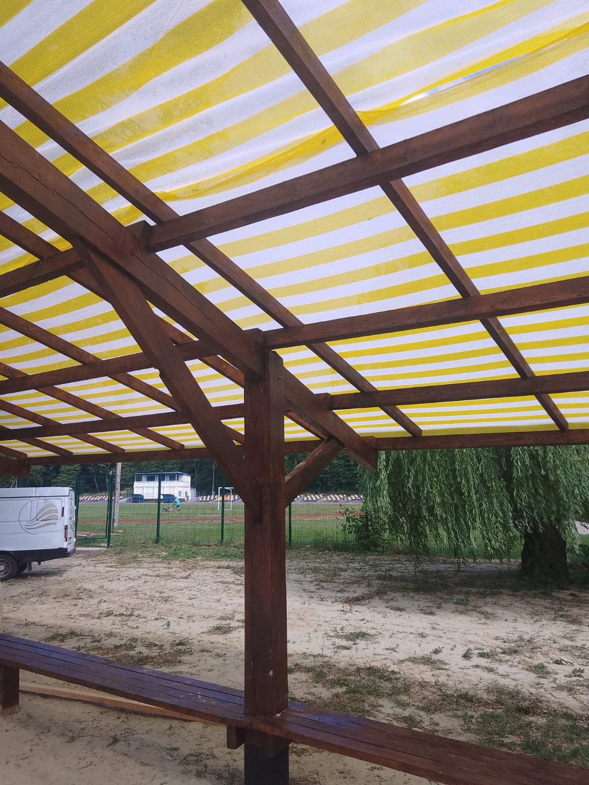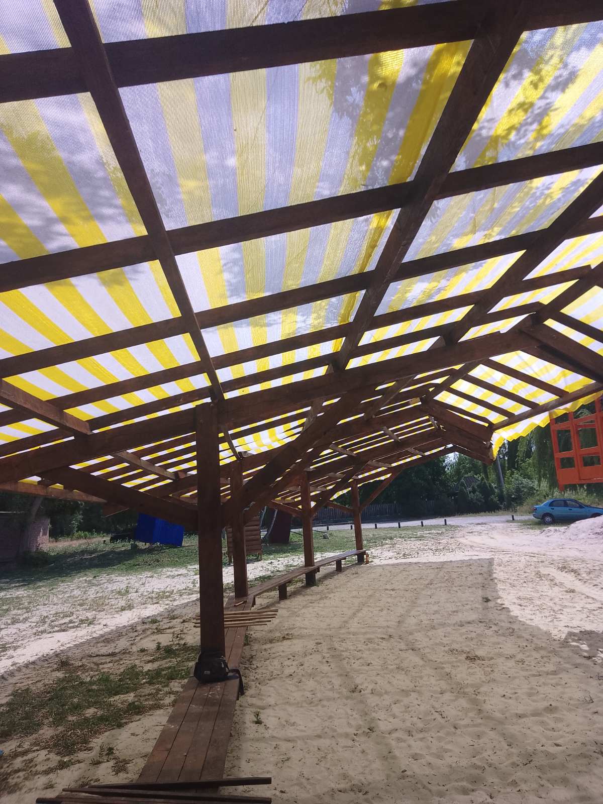 Загалом було зведено дерев’яну конструкцію, яку пофарбували для захисту та естетики. Завершальним етапом стало натягування сонцезахисної сітки.