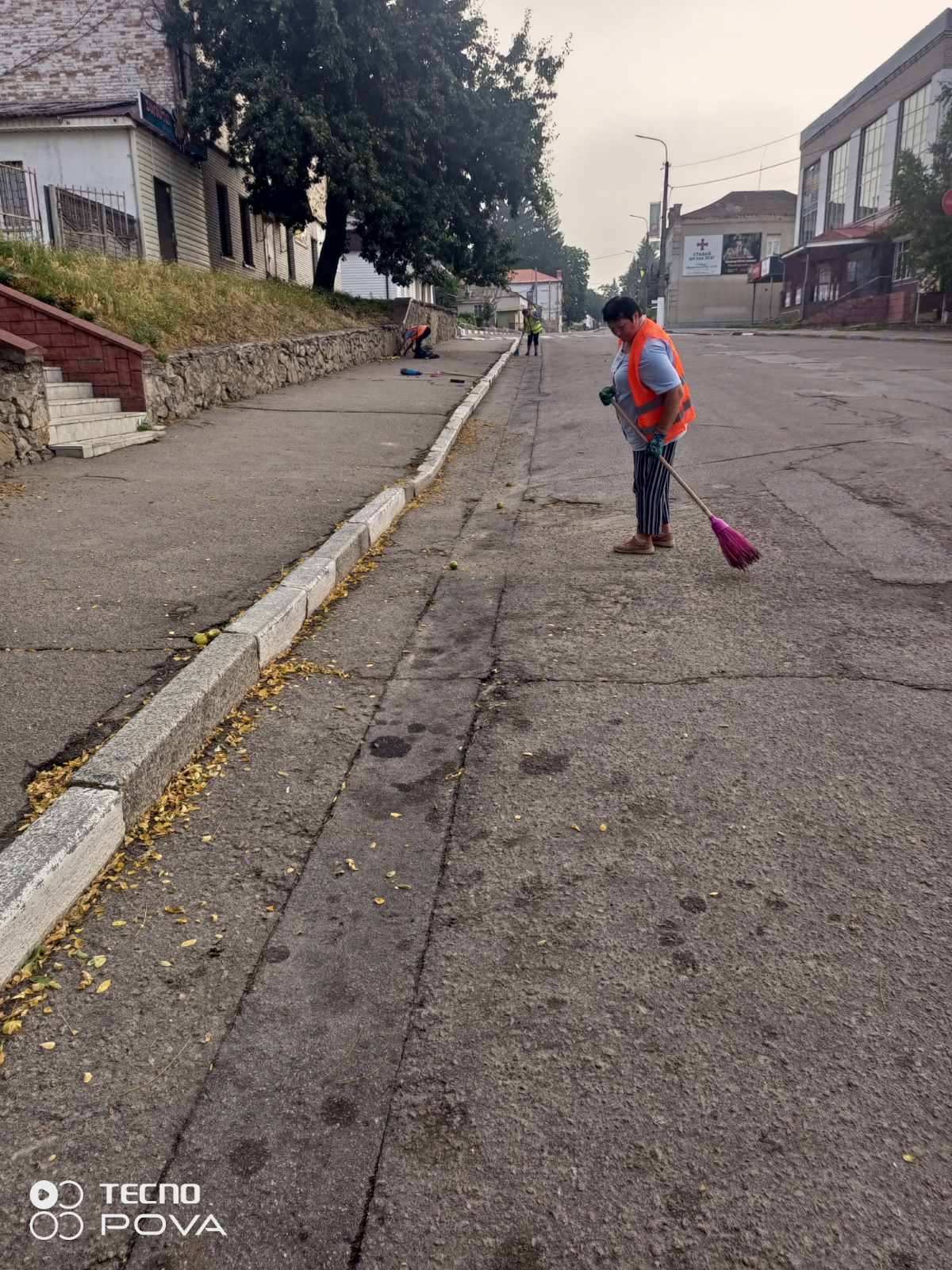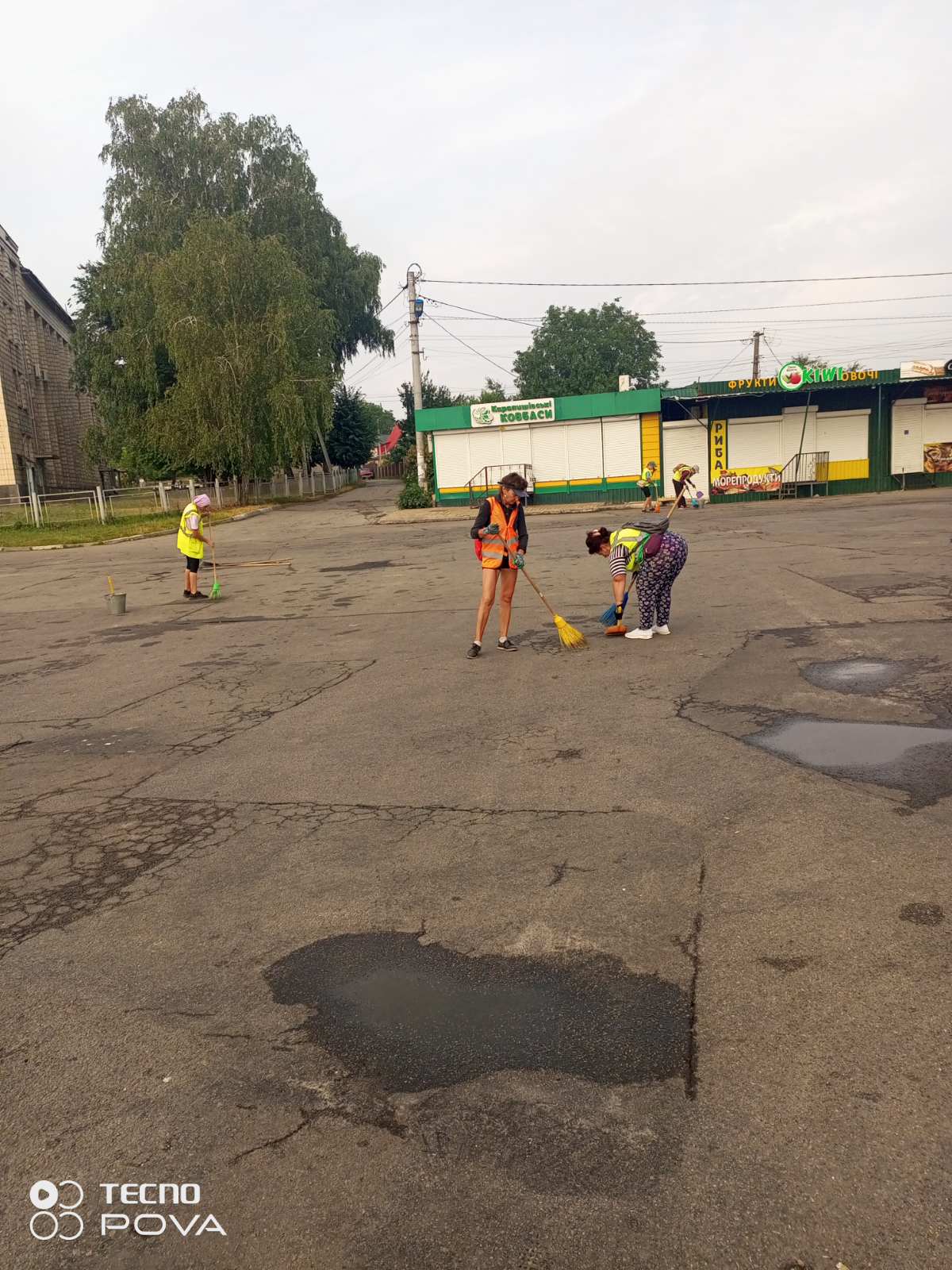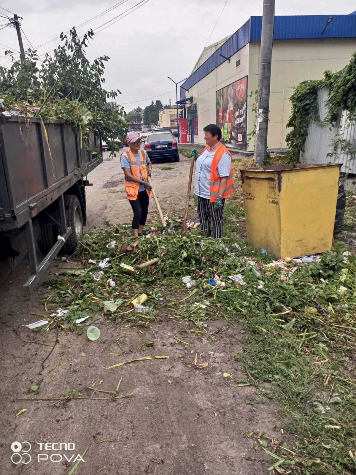 Були проведені роботи з прибирання території біля контейнерних майданчиків, зокрема тих, що розташовані біля магазину «АТБ» та на центральній площі міста. Це включає підмітання, обрізку гілок дерев та збір накопиченого сміття. Також було здійснено прибирання сміття вздовж бордюрів по вулиці Шевченка, що сприяє загальному естетичному вигляду вулиці.