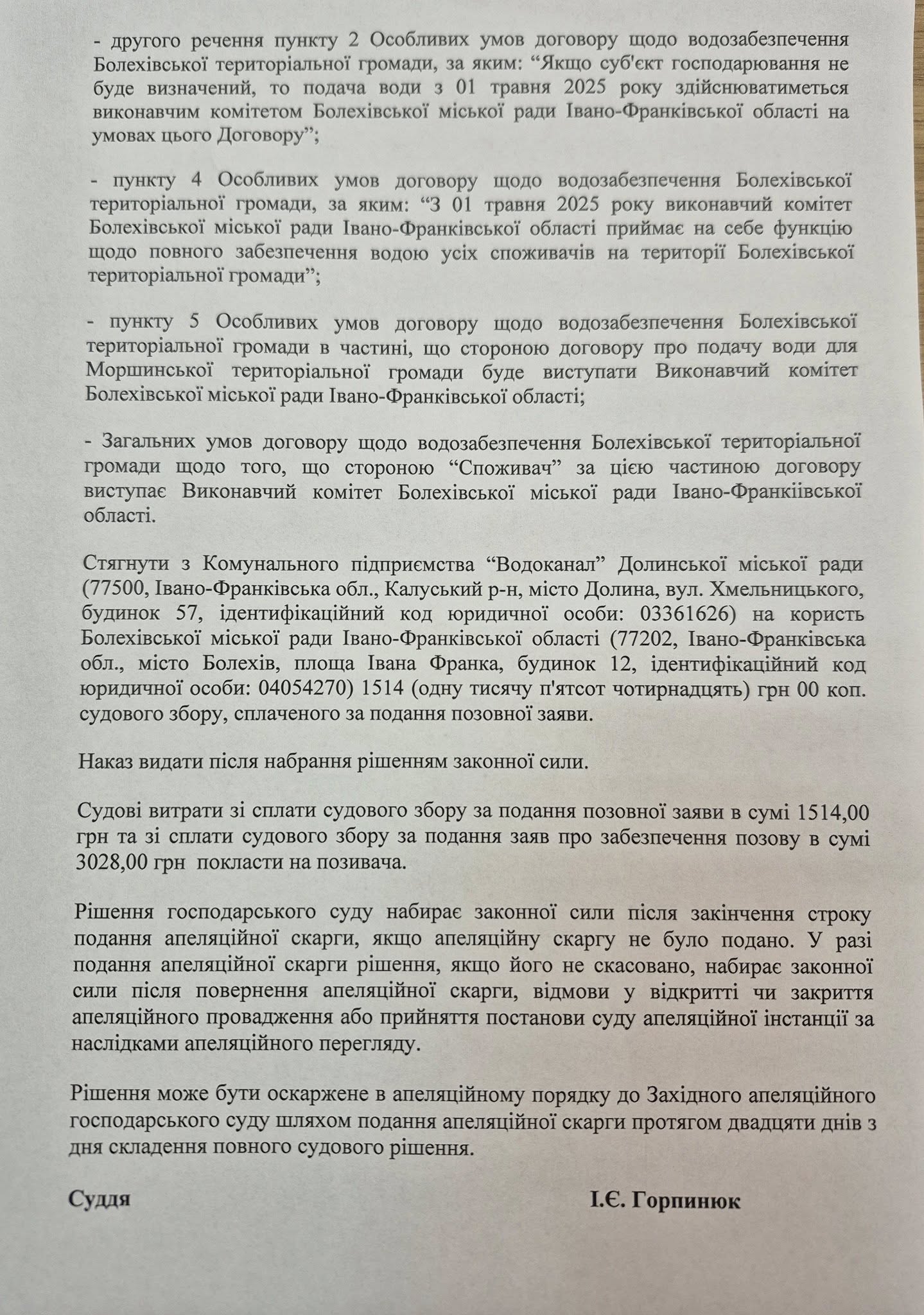🔹 Рішенням Господарського суду Івано-Франківської області від 27.06.2025 (справа №909/584/25) визнано недійсними положення договору від 28.02.2025 між виконавчим комітетом Болехівської міської ради та КП «Водоканал» Долинської міської ради, які протиправно визначали виконавчий комітет Болехівської міської ради постачальником послуг централізованого водопостачання. Суд підтвердив: міська рада не може бути «Споживачем» послуг централізованого водопостачання, а тому не має законних підстав здійснювати оплату за цим договором.