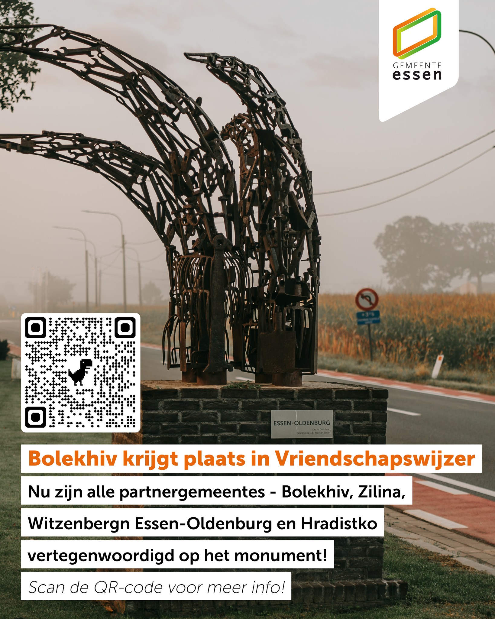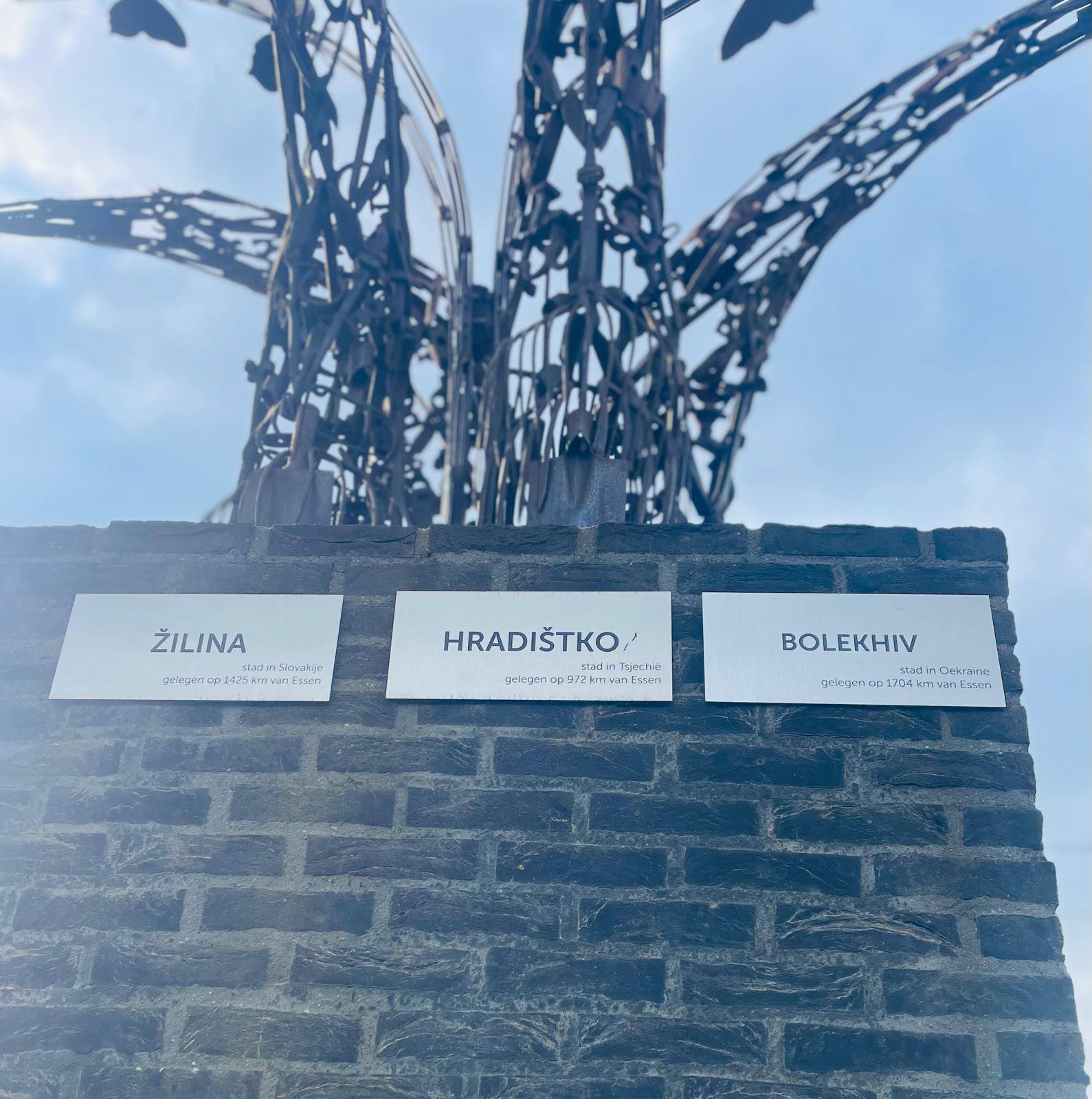 📍 Пам’ятник «Вказівник дружби» було відкрито у 2011 році. Його створив талановитий бельгійський митець Руді Де Фогт. Чотири стовпи вказують на міста-побратими Ессена: Градиштко, Ессен-Ольденбург, Жиліна та Вітценберг. Кожен напрямок символізує унікальне партнерство та взаєморозуміння.