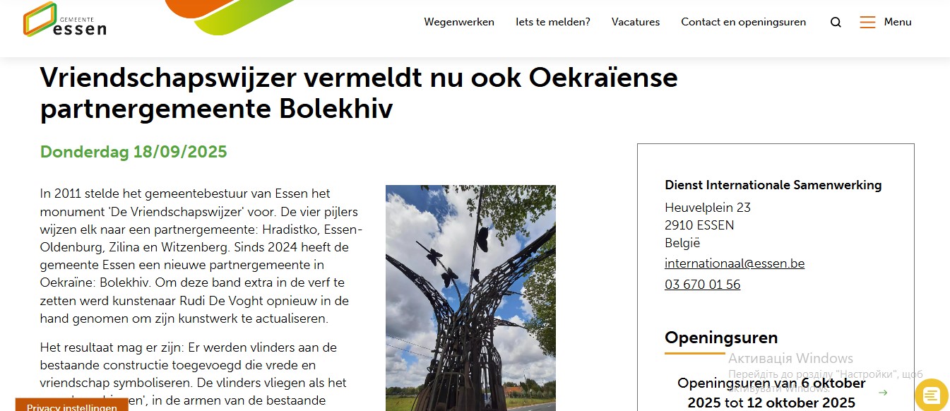 Ми з гордістю повідомляємо, що місто-побратим Ессен (Бельгія) офіційно додало Болехів до свого символічного пам’ятника — «Вказівника дружби»! Це особливий знак поваги, партнерства та єднання наших громад, що підкреслює міцні зв’язки між Україною та Бельгією.
