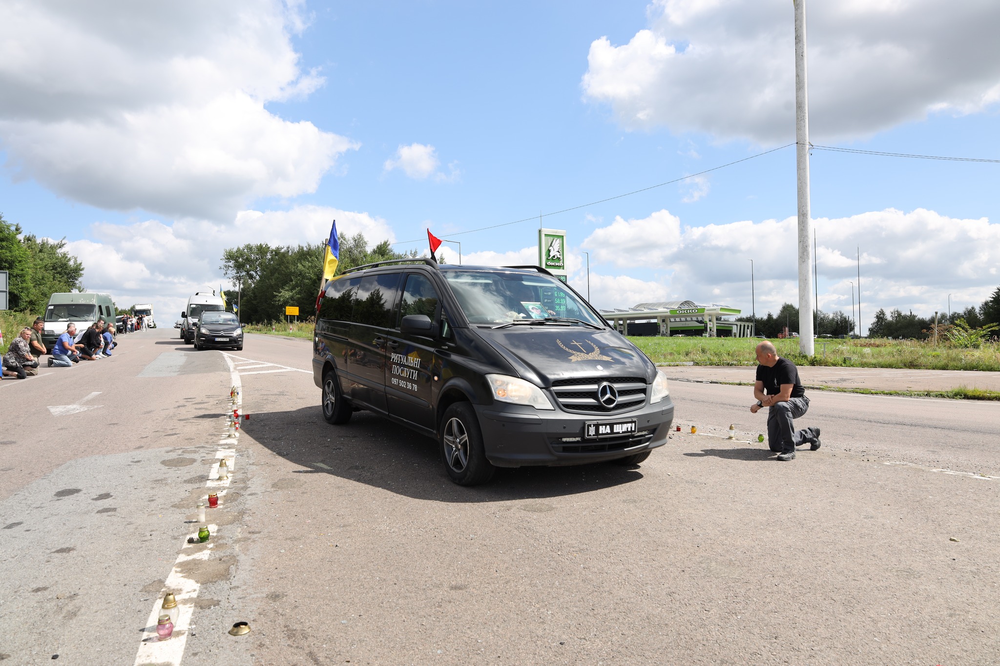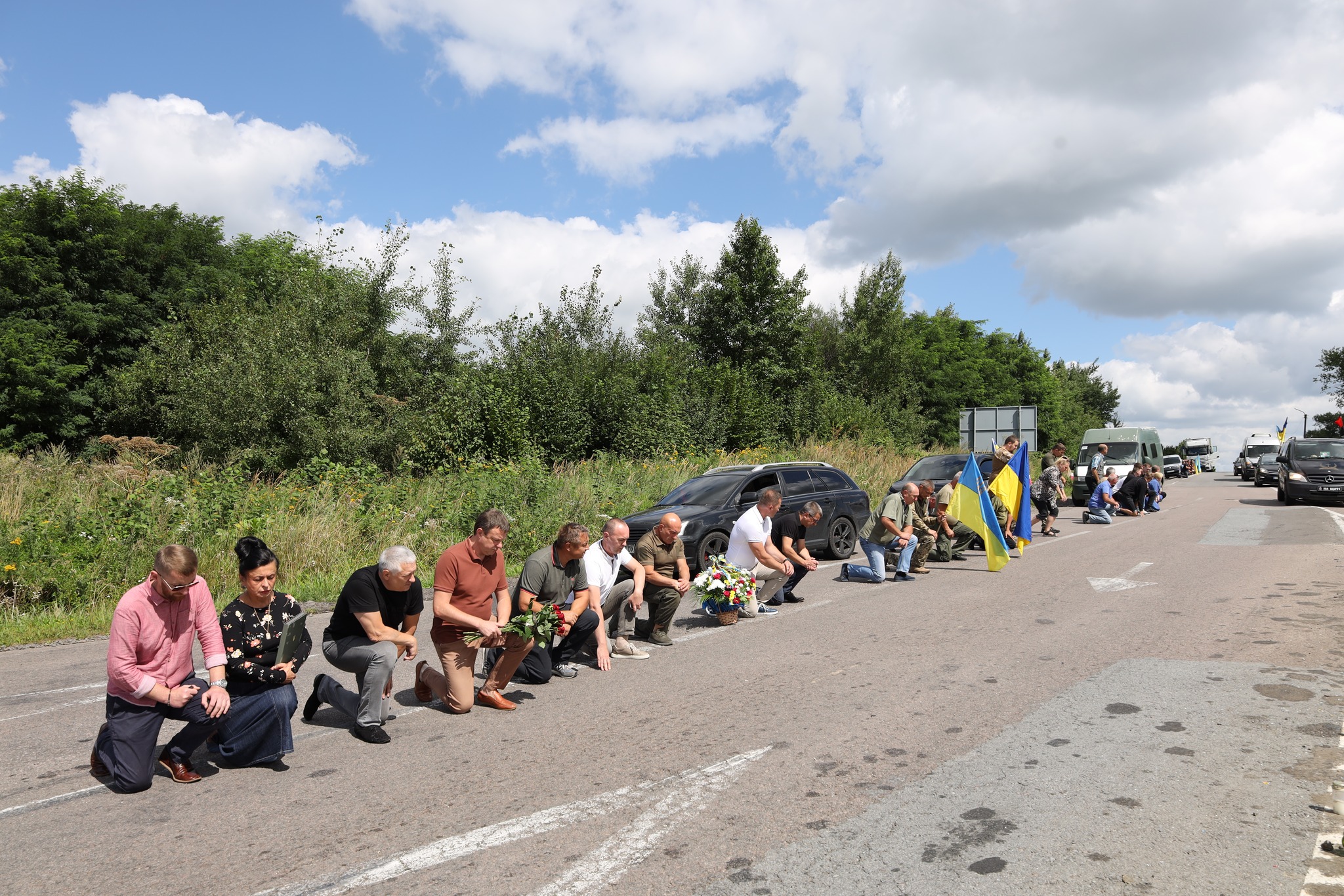На Перехресті Героїв присутні помолилися за упокій світлої душі Захисника. Після цього траурна колона рушила до Борислава до Поминальної каплиці при парафії Зіслання Святого Духа. На колінах, із державними прапорами в руках громада зустрічала свого Героя, схиляючи голови у глибокій пошані.