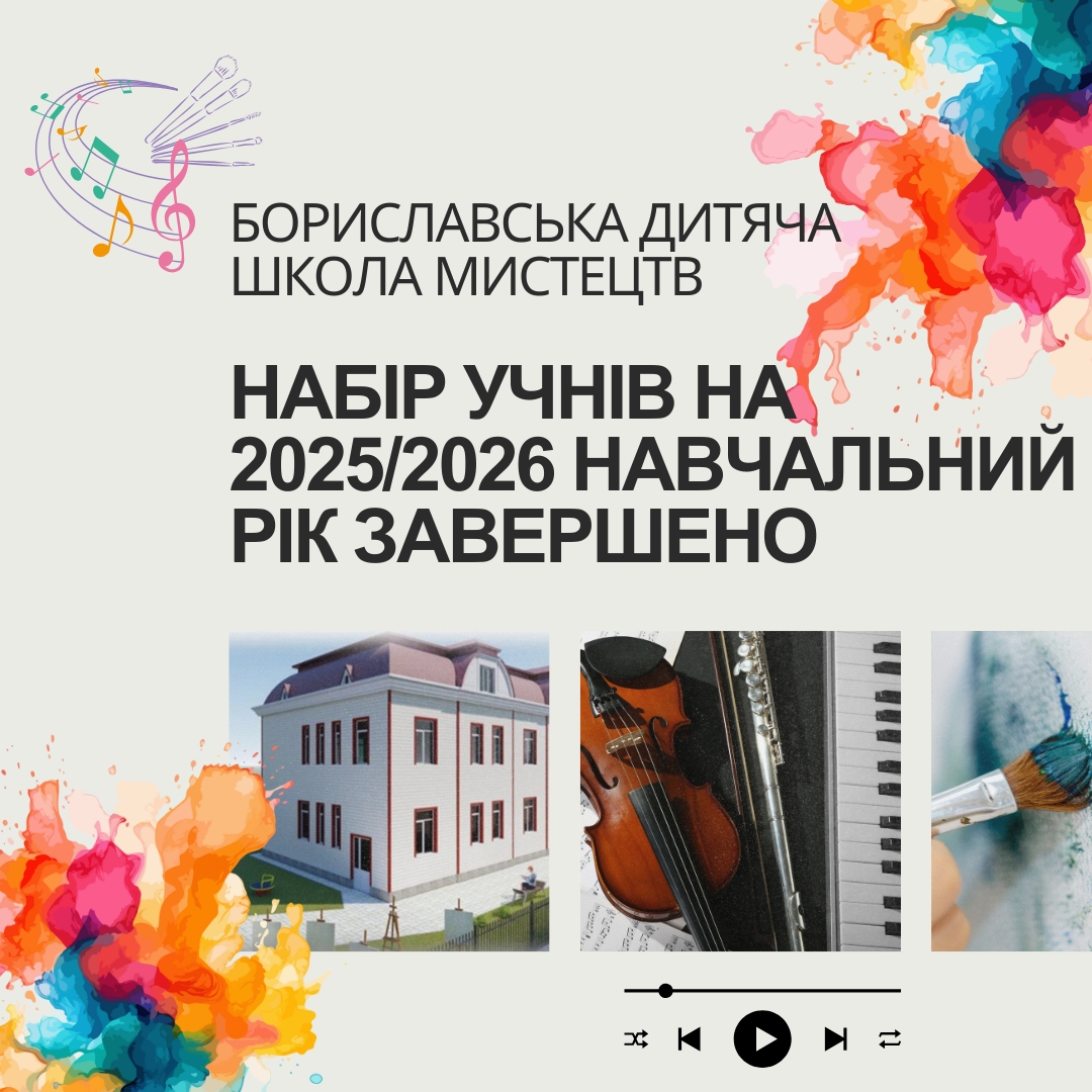 🗓 Якщо з вами не зв’яжуться до 30 жовтня 2025 року, не засмучуйтесь. Новий набір до Бориславської дитячої школи мистецтв розпочнеться вже у квітні 2026 року. Ми продовжуємо плекати таланти та навчати нові покоління юних митців. Попереду на дітей чекає дивовижна подорож у світ мистецтва, сповнена чарівних мелодій, яскравих фарб та незабутніх вражень. Нехай кожен урок буде джерелом натхнення, а кожне виступ – кроком до здійснення найсміливіших мрій.