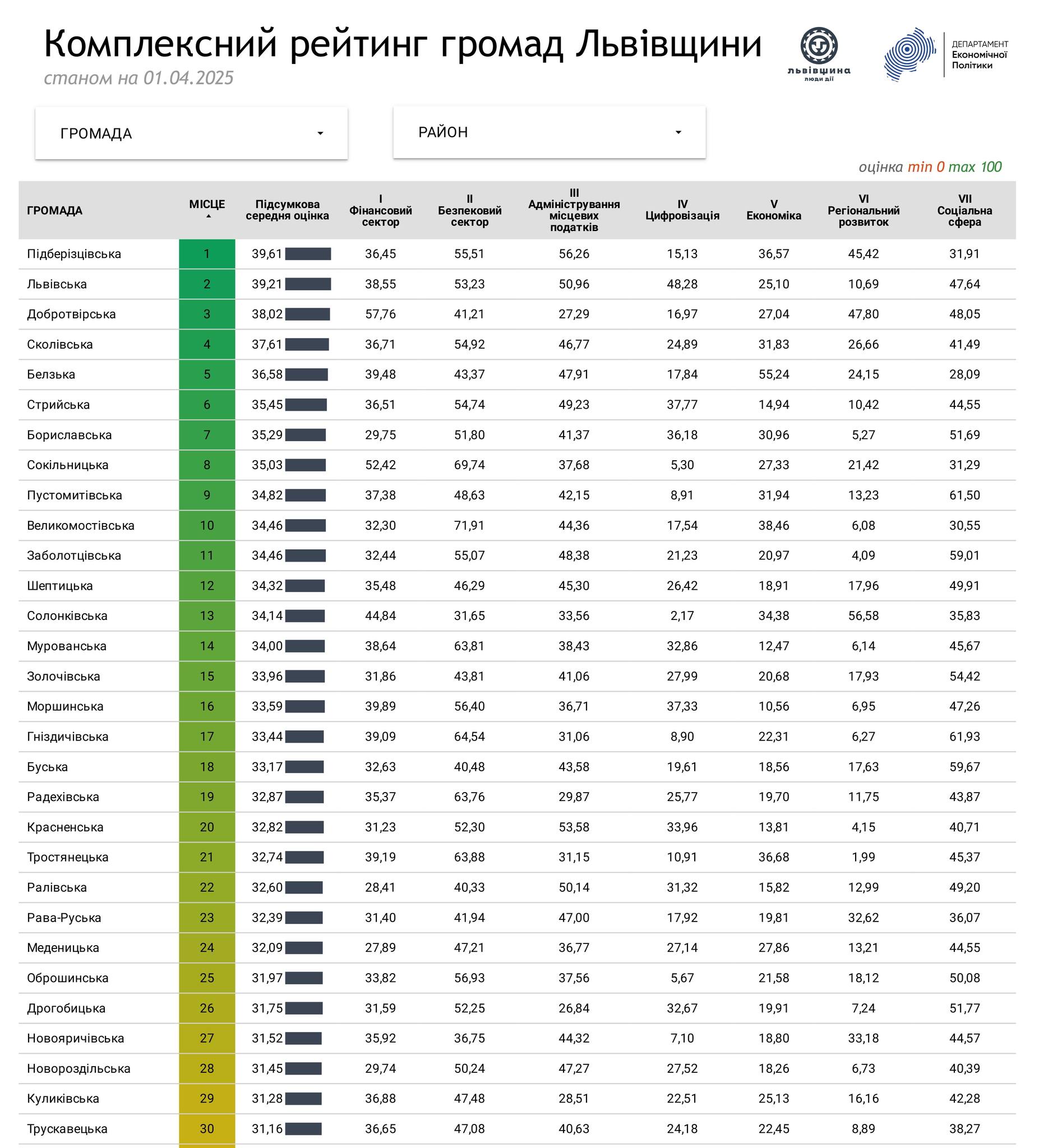 👉 Рейтинг, складений Львівською обласною державною адміністрацією у березні, базується на 44 показниках, які охоплюють ключові сфери життя громади. Такий комплексний підхід дозволяє всебічно оцінити роботу кожної територіальної одиниці та виявити сильні сторони.