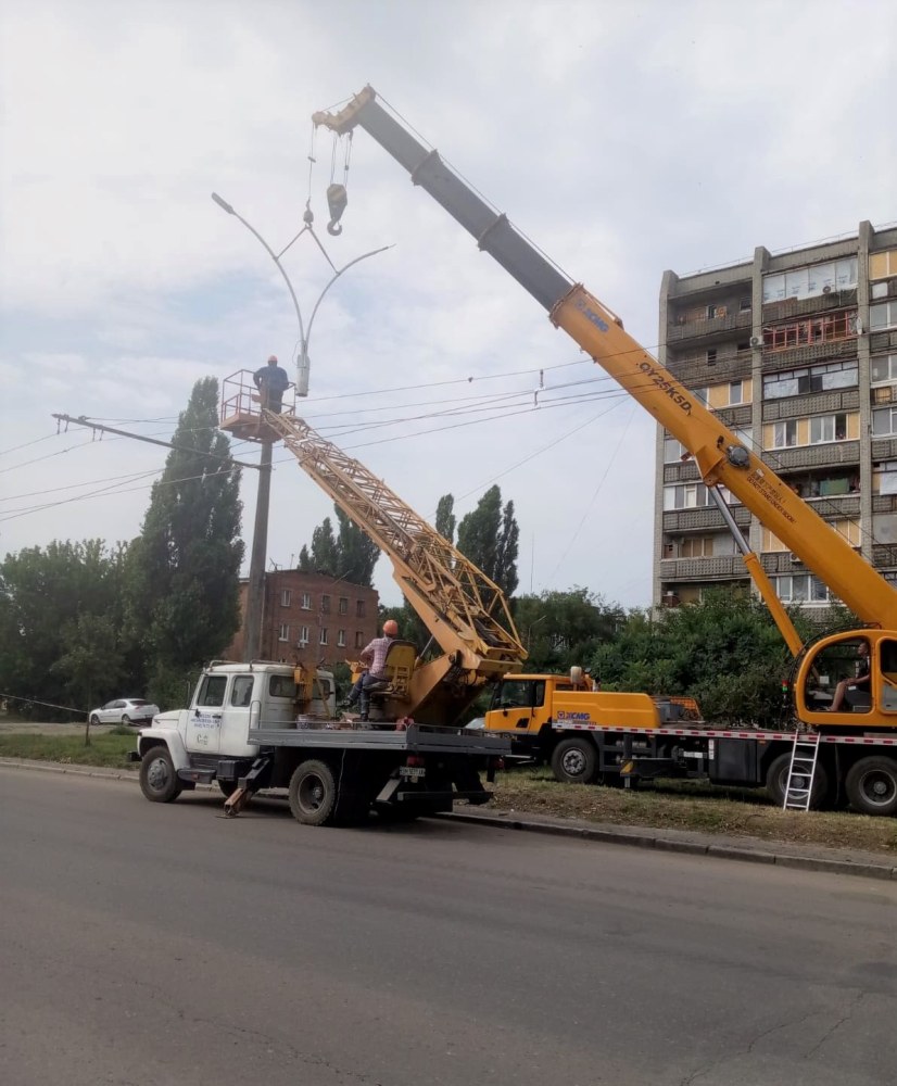 ▪️На просп. Перемоги електромонтери змонтували нові кронштейни та світильники замість пошкоджених у результаті ворожого обстрілу.
