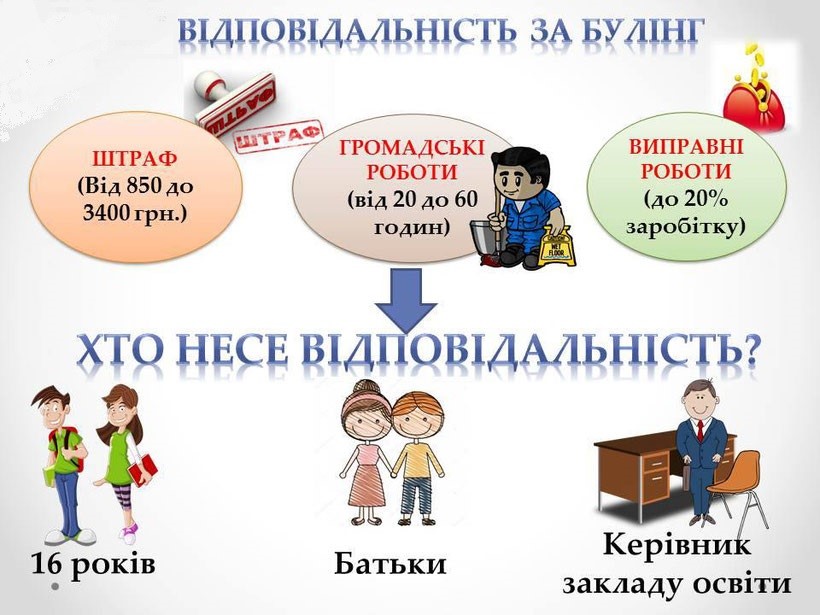 • Якщо булінг вчиняє дитина віком до 16 років, — відповідальність несуть батьки або законні представники.