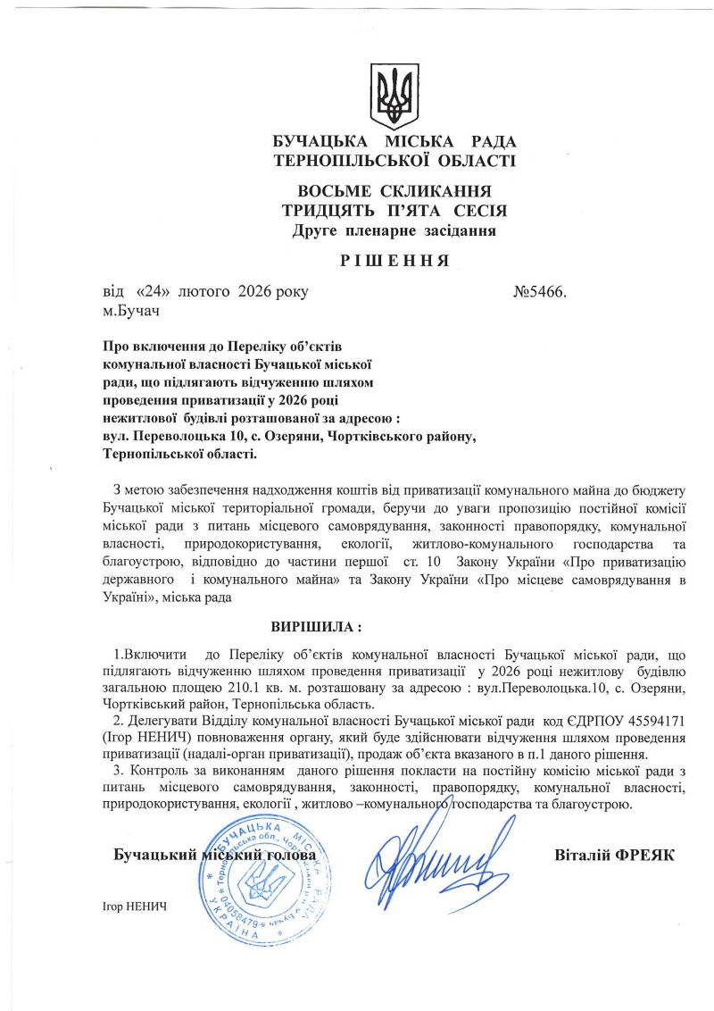 Бучацька міська рада інформує про те, що 24 лютого 2026 року прийняте рішення «Про включення до Переліку об’єктів комунальної власності Бучацької міської ради, що підлягають відчуженню шляхом проведення приватизації у 2026 році нежитлової будівлі розташованої за адресою: вул. Переволоцька 10, с. Озеряни, Чортківського району, Тернопільської області» №5466.