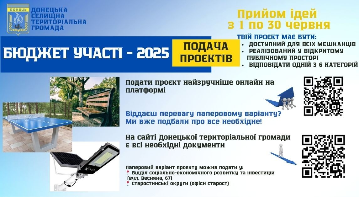 📄 Деталі та форма для подання проєктів – на офіційному сайті за посиланням https://donetska-gromada.gov.ua/2025-rik-13-54-03-19-05-2025/. Ознайомтеся з усіма вимогами та рекомендаціями, щоб ваш проєкт був максимально конкурентоспроможним.