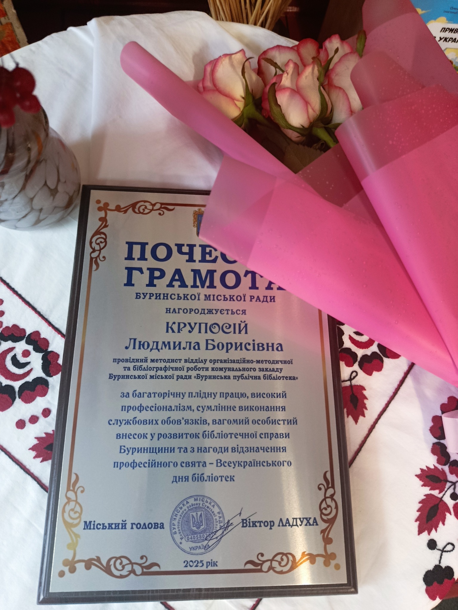 Особливо відзначено роботу Валентини БОРЩЕНКО, виконуючої обов’язки директора комунального закладу «Буринська публічна бібліотека». Її нагороджено Грамотою голови Конотопської районної державної адміністрації за плідну працю, високий професіоналізм, сумлінне виконання службових обов’язків та вагомий внесок у розвиток бібліотечної справи громади. Це визнання підкреслює її відданість справі збереження та популяризації книги.