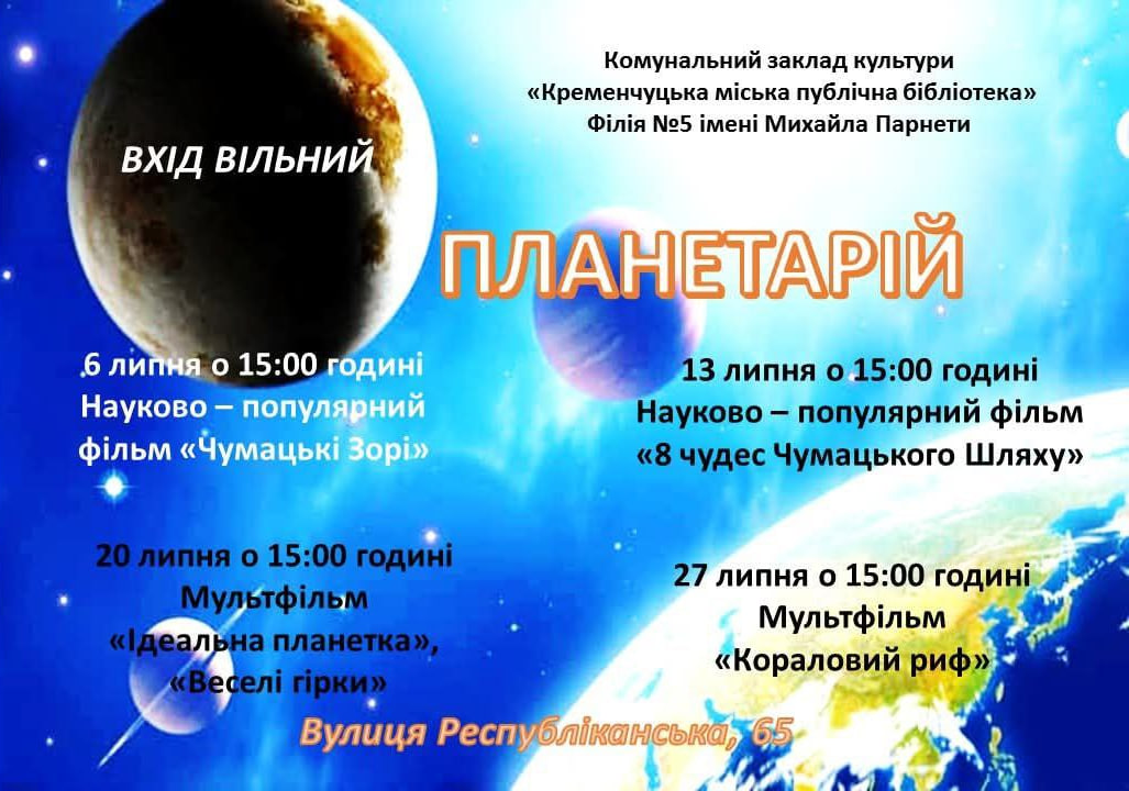 🔸 13 липня о 15:00 — науково-популярний фільм «8 чудес Чумацького Шляху»;