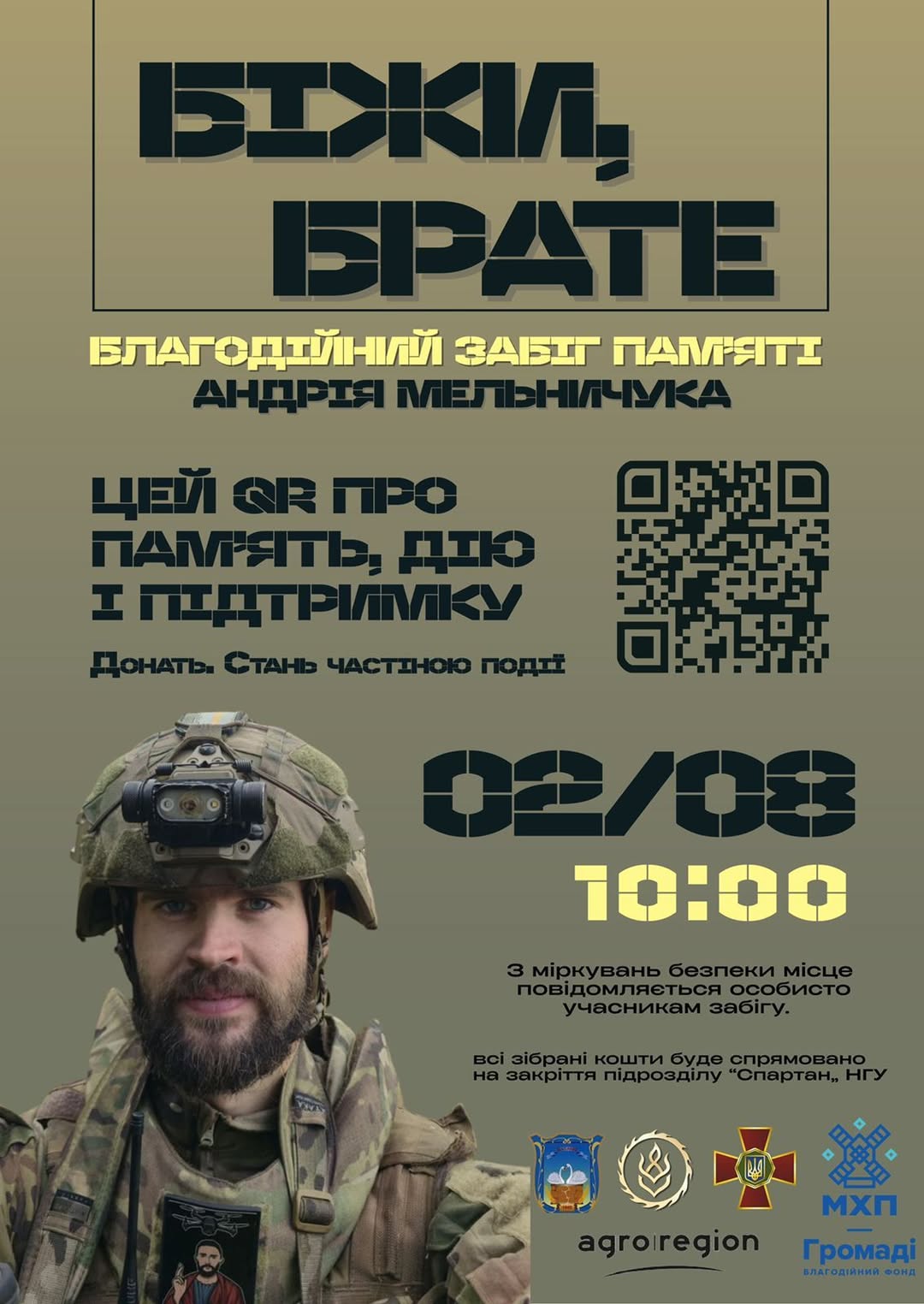 🏃♂️ «Біжи, Брате» — благодійний забіг памʼяті Героя Андрія «Брата» Мельничука, який відбудеться 2 серпня о 10:00. Андрій вважав біг своєю віддушиною, способом триматися та внутрішнім вогнем. Цього дня ми вшановуємо його пам’ять з вдячністю, згадуючи його як Героя і справжнього Брата для багатьох. Запрошуємо вас долучитися до забігу, щоб пробігти свою дистанцію з любов’ю, пам’яттю та вдячністю. Вас чекають різні дистанції: дитяча (300 м), символічна (1 км), звичайна (2 км) та професійна (5 км). Щоб взяти участь, оберіть дистанцію, зробіть будь-який донат на вказану банківську карту, надішліть скріншот у приватні повідомлення та отримайте номер учасника. Бажаєте особливий номер? Додайте 250 грн до донату, і бажаний номер буде вашим. Усі зібрані кошти будуть спрямовані на підтримку підрозділу Андрія — 3-ї бригади оперативного призначення «Спартан» НГУ. Ми біжимо, бо пам’ятаємо. Ми біжимо, бо дякуємо. Біжимо, Брате. 🫂🤍 Реєстрація за посиланням: https://send.monobank.ua/jar/2YTZ2J1we2. Контактний телефон: 096 397 62 69. Локація забігу буде повідомлена учасникам за тиждень до заходу. Дякуємо за розуміння та дотримання заходів безпеки.
