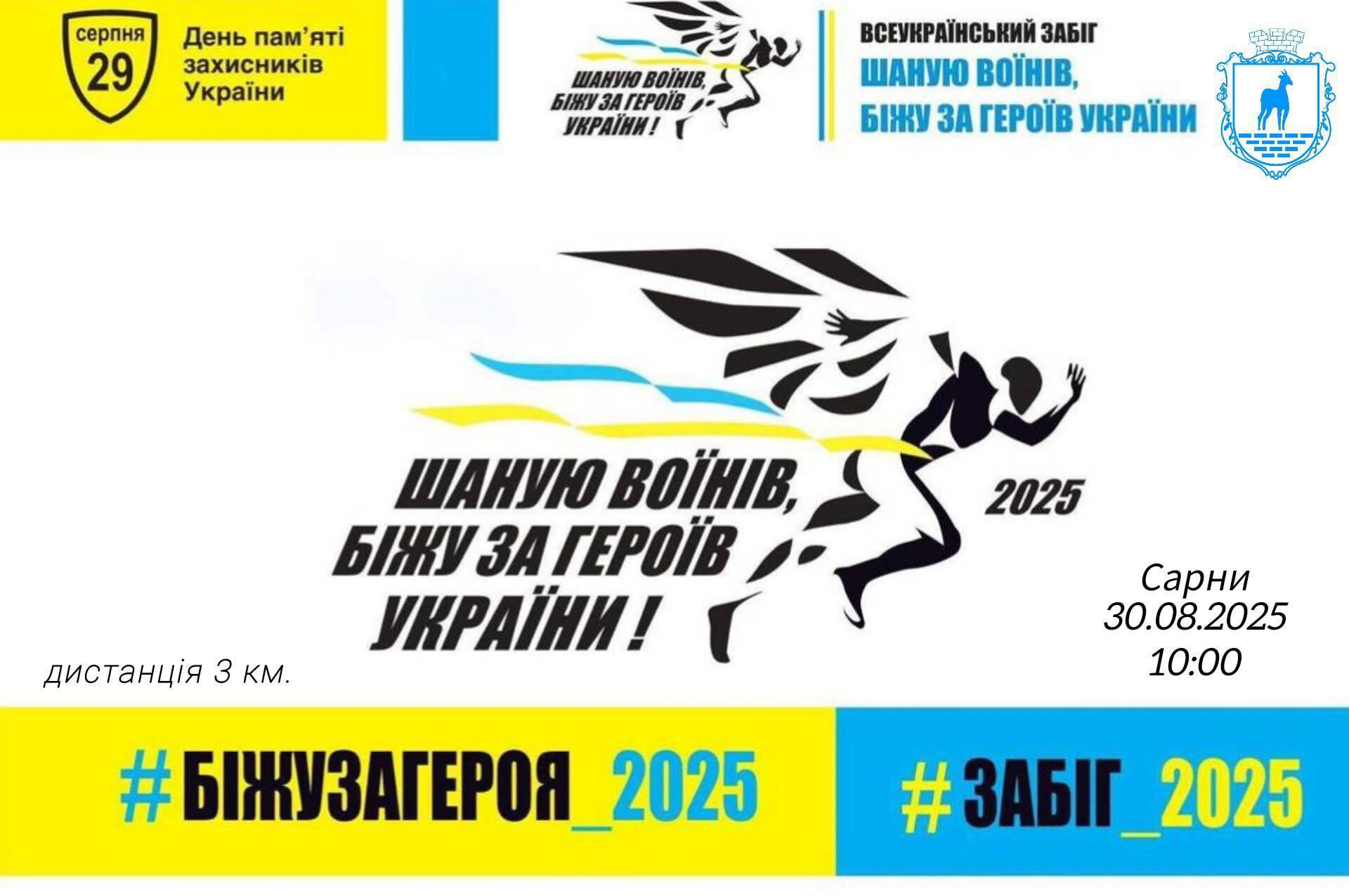 🗓️30 серпня – Сарненська міська територіальна громада приєднається до загальноукраїнського забігу памʼяті захисників, які загинули в боротьбі за незалежність, суверенітет та територіальну цілісність України.