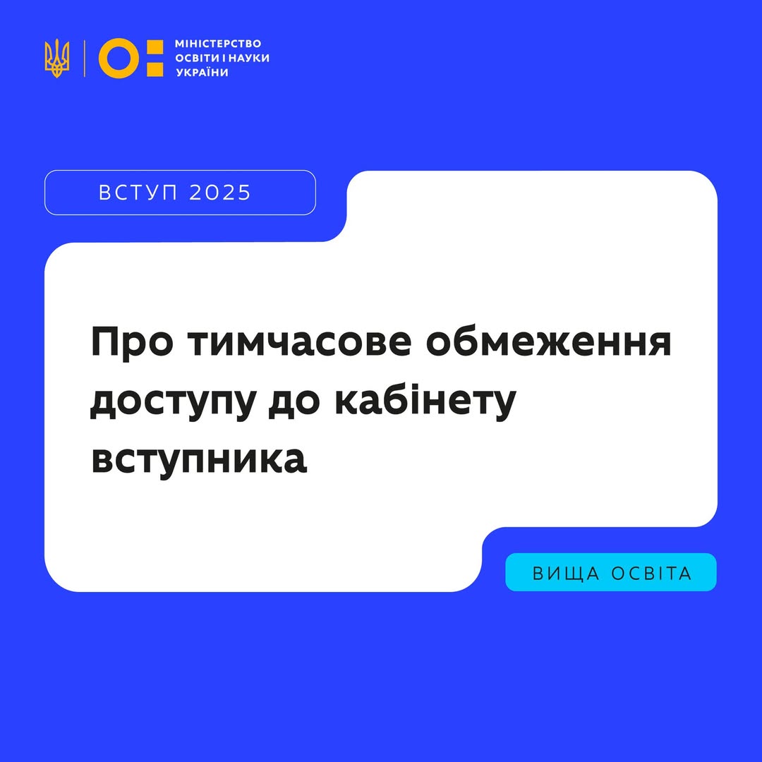 ⛔️ З 15:00 4 серпня тимчасово буде обмежено доступ до ЄДЕБО, сайту «Вступ-2025» та електронних кабінетів вступників — у зв’язку з підготовкою та виконанням алгоритму адресного розміщення (для вступників на бакалавра, а також на магістратуру медичного, ветеринарного та фармацевтичного спрямувань).