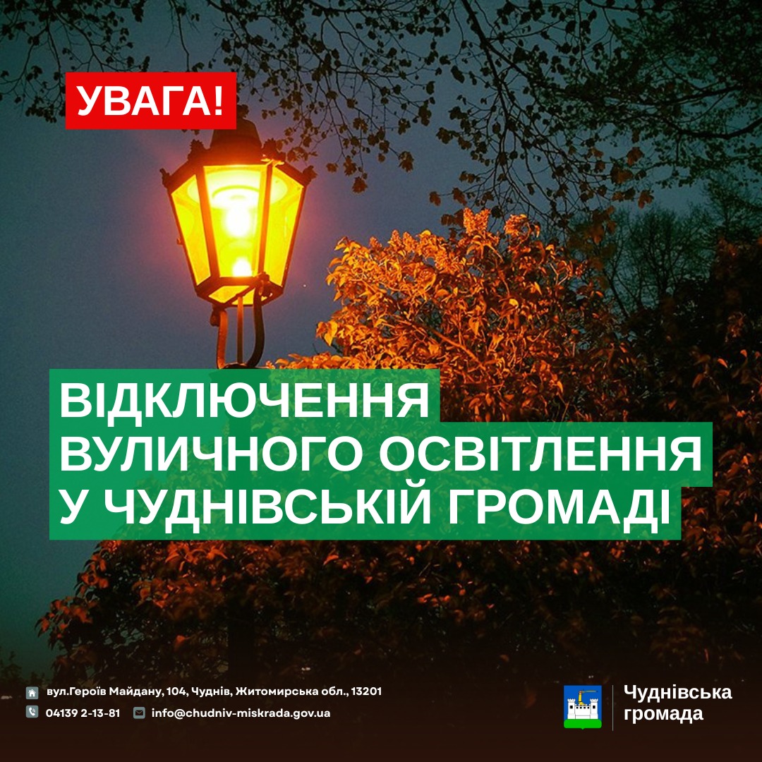 У зв’язку з критичною ситуацією в енергосистемі держави та на виконання вказівок НЕК «Укренерго» щодо зменшення споживання електроенергії, з 24 жовтня 2025 року на території Чуднівської громади тимчасово не працюватиме вуличне освітлення. Це вимушений захід, який запроваджується задля стабілізації роботи енергетичної системи країни, що зазнає значних пошкоджень внаслідок російських атак. Ми розуміємо, що відсутність вуличного освітлення може спричинити незручності, однак це необхідний крок для забезпечення загальної енергетичної безпеки.