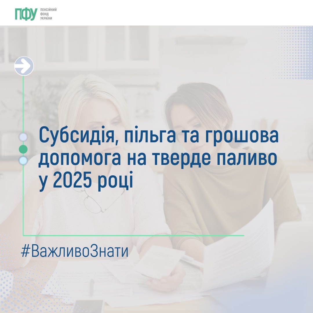 - З інформацією про надання одноразової грошової допомоги на придбання твердого пічного побутового палива в опалювальному сезоні 2025-2026 років можна ознайомитись за посиланням: https://www.pfu.gov.ua/2174094-shhodo-nadannya-odnorazovoyi-groshovoyi-dopomogy-na-prydbannya-tverdogo-pichnogo-palyva-v-opalyuvalnomu-sezoni-2025-2026-rokiv/.