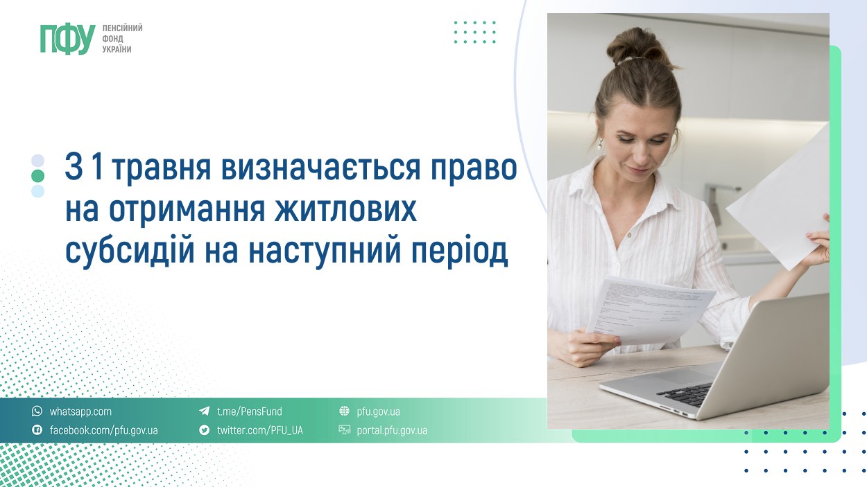 З 1️⃣ травня органи Пенсійного фонду України визначають право на отримання житлових субсидій на наступний період (по 30 квітня 2026 року).