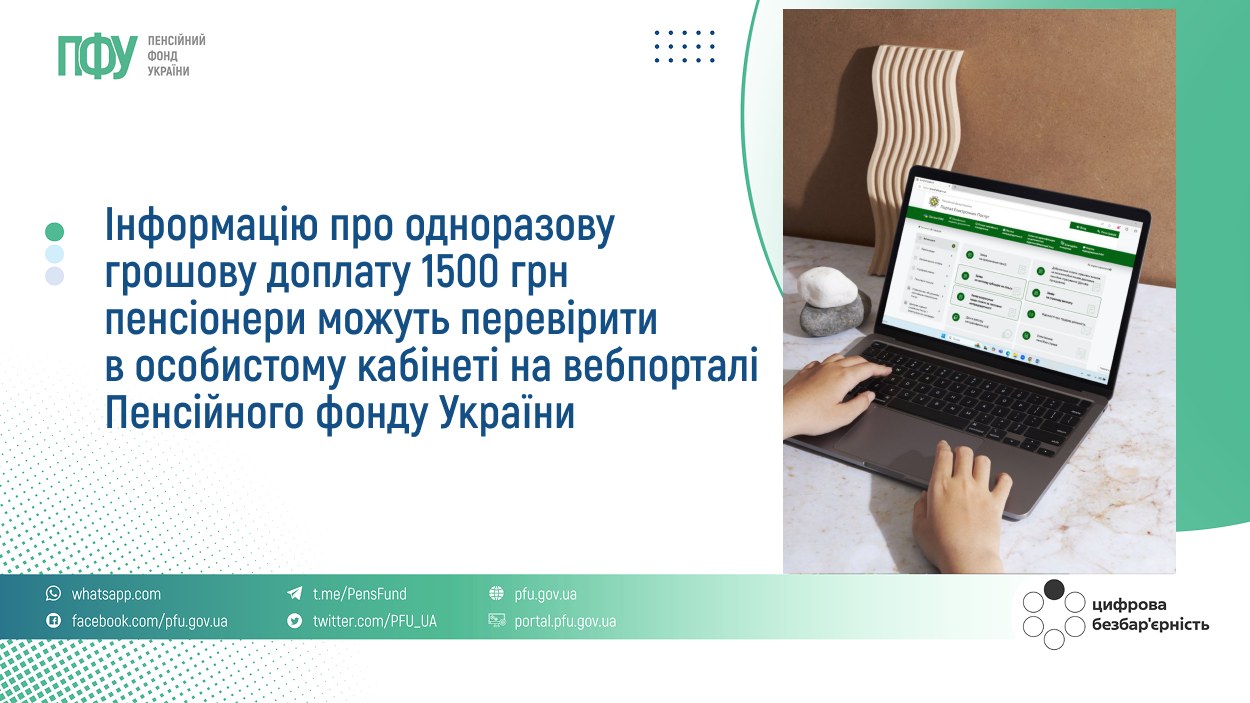 👩💻 Пенсіонери можуть переглянути інформацію про виплату 1500 грн в особистому кабінеті на вебпорталі електронних послуг Пенсійного фонду України.