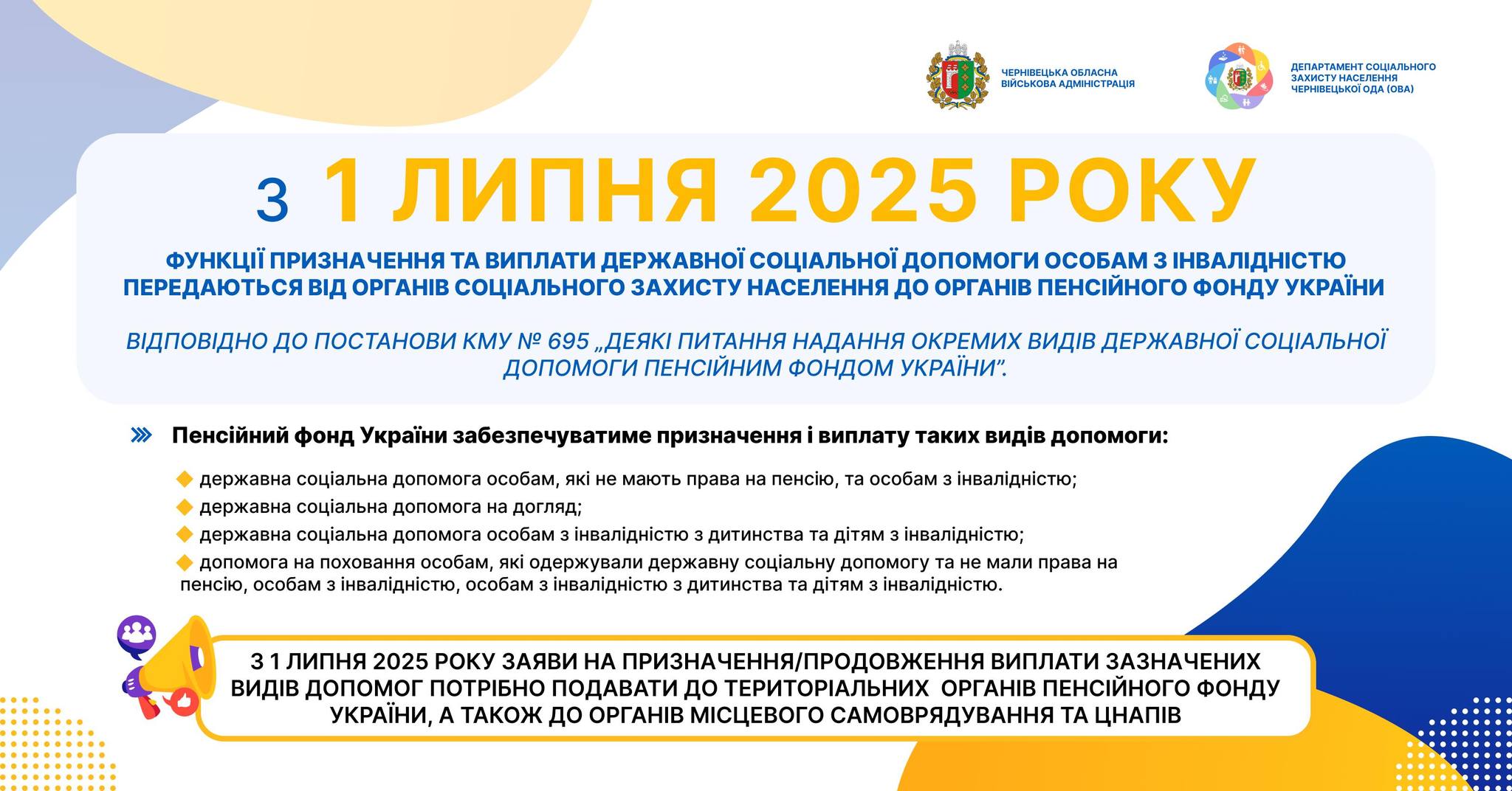 👉 Важливо! З 1 липня 2025 року функції призначення та виплати державної соціальної допомоги особам з інвалідністю передаються від ‼️ органів соціального захисту населення до органів 👉 Пенсійного фонду України відповідно до постанови КМУ № 695 “Деякі питання надання окремих видів державної соціальної допомоги Пенсійним фондом України”.