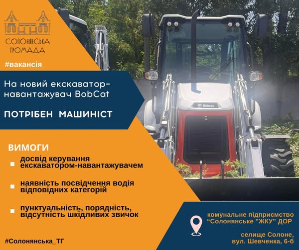 ℹ️ На новий екскаватор-навантажувач BobCat комунальне підприємство «Солонянське ЖКУ»ДОР» запрошує до співпраці машиніста екскаватора