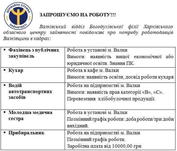 За детальною інформацією про вакансії звертайтеся до Валківського відділу Богодухівської філії Харківського обласного центру зайнятості.