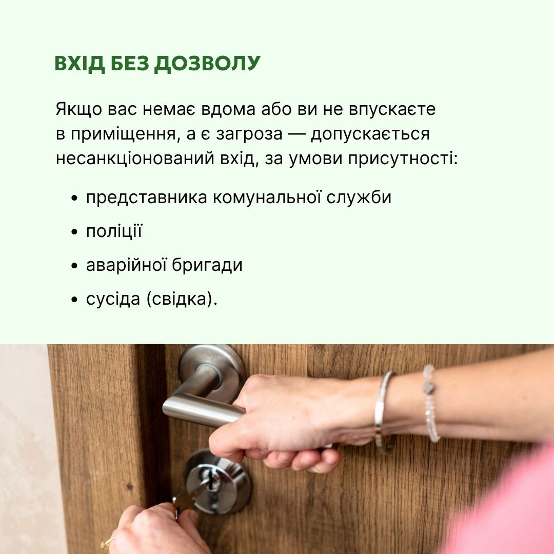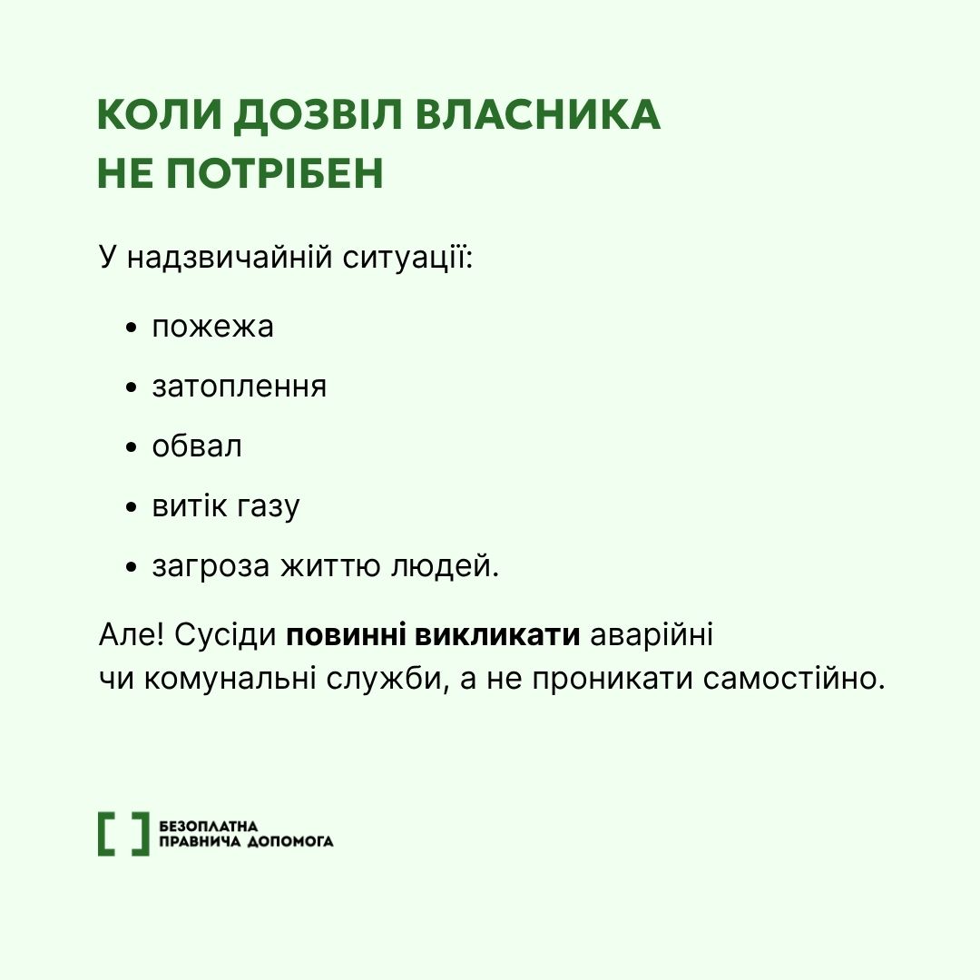 У випадку надзвичайних ситуацій, таких як пожежа, стихійне лихо або необхідність надання термінової медичної допомоги, представники екстрених служб мають право увійти до вашого житла для забезпечення безпеки та порятунку життя. Це робиться з метою мінімізації шкоди та захисту громадян.