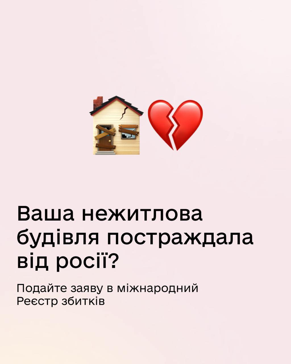 Російська Федерація має понести відповідальність за всі руйнування, які вона спричинила. Тому в Реєстрі збитків створено окрему категорію для нежитлової нерухомості. Задокументуйте пошкодження вашого гаража, прибудинкових приміщень або складу – це перший крок до отримання справедливої компенсації.