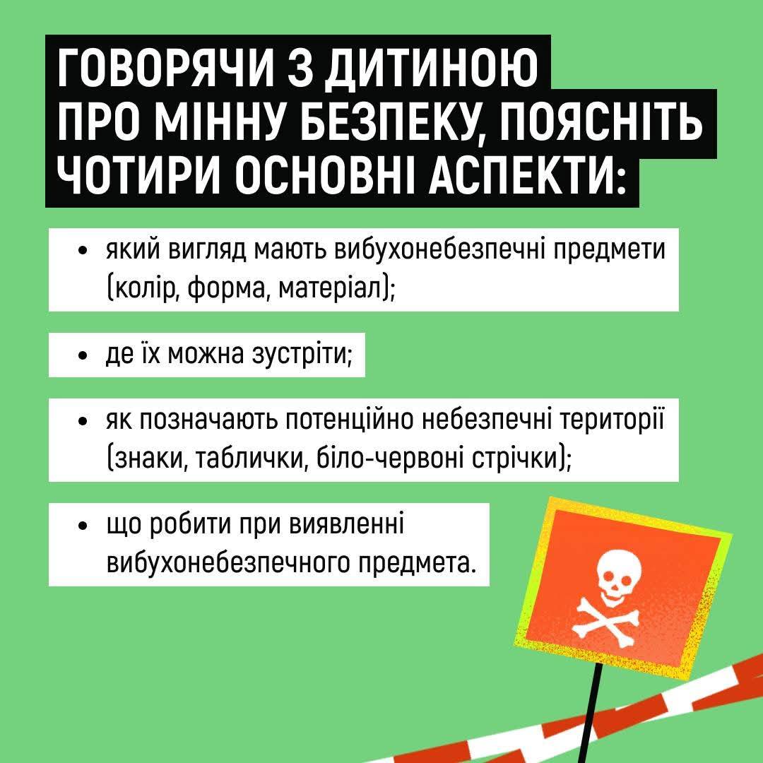 Навчіть своїх дітей розпізнавати потенційні небезпеки. Поясніть, чому не можна чіпати підозрілі предмети, які можуть бути схожі на іграшки, але насправді є мінами або вибухівкою. Важливо наголосити на тому, що в жодному разі не можна намагатися їх самостійно знешкодити чи перенести.
