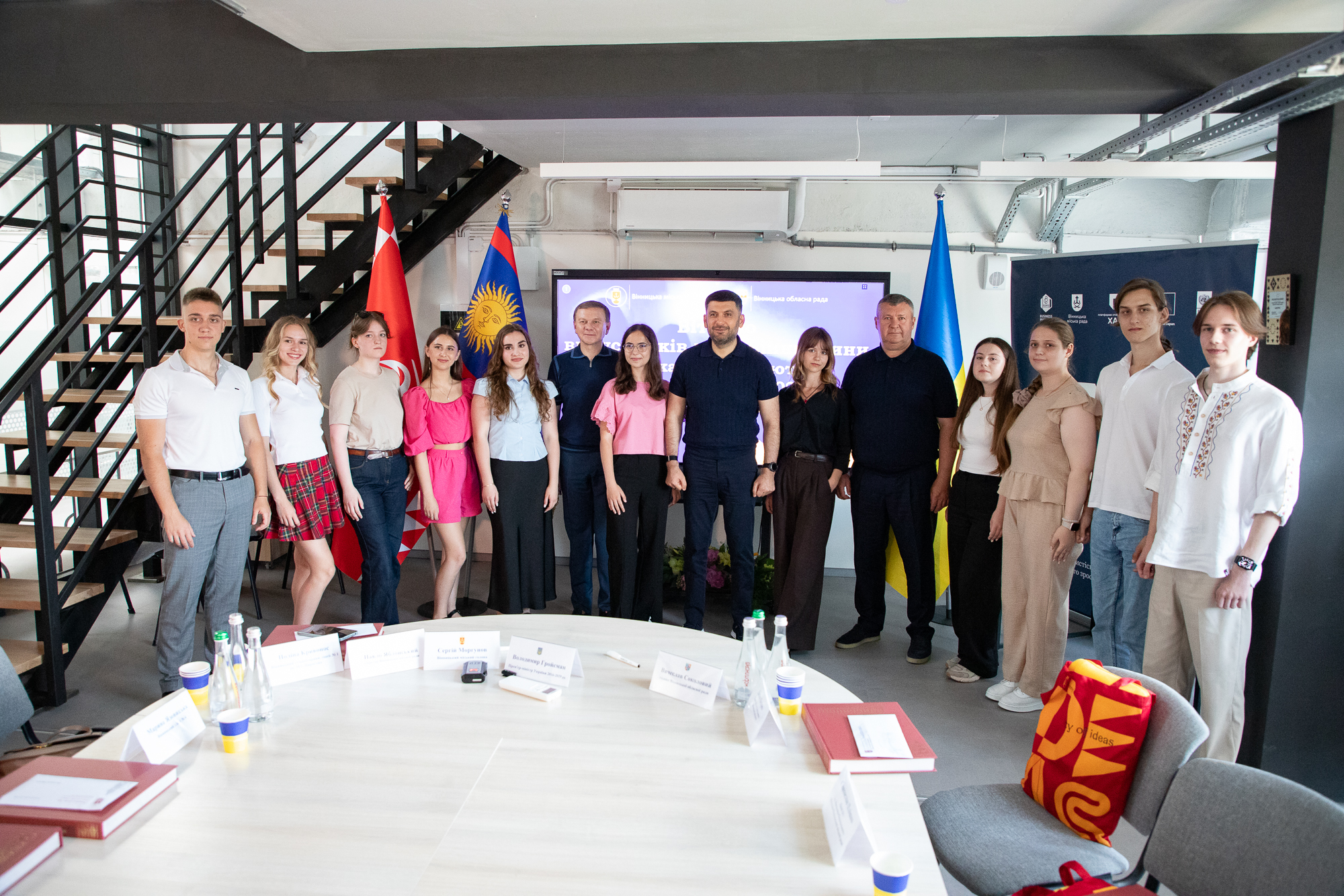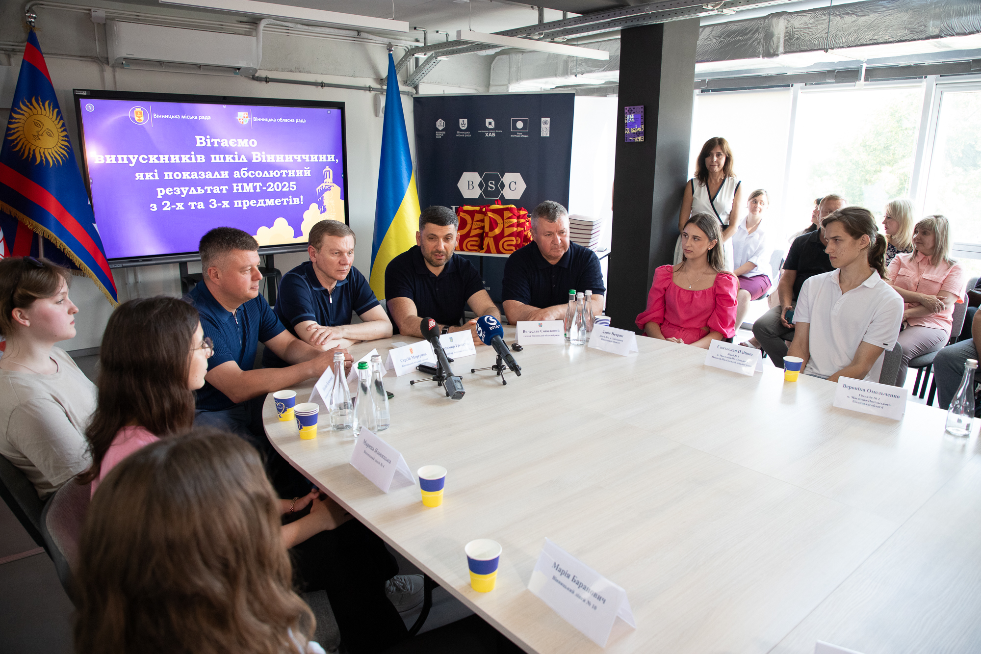 На Вінниччині цього року 11 випускників отримали 200 балів з двох предметів за результатами національного мультипредметного тесту (НМТ), а одна випускниця здобула 200 балів із трьох предметів. Голова обласної Ради В’ячеслав Соколовий, Вінницький міський голова Сергій Моргунов та Прем’єр-міністр України 2016-2019 років Володимир Гройсман зустрілися з цими обдарованими молодими людьми. На зустрічі також були присутні заступник голови обласної Ради Ігор Івасюк, секретар Вінницької міської ради Павло Яблонський, заступниця міського голови Галина Якубович та батьки випускників. Керівники області й міста поспілкувалися з випускниками, дізналися про їхні майбутні плани та відповіли на поставлені запитання.