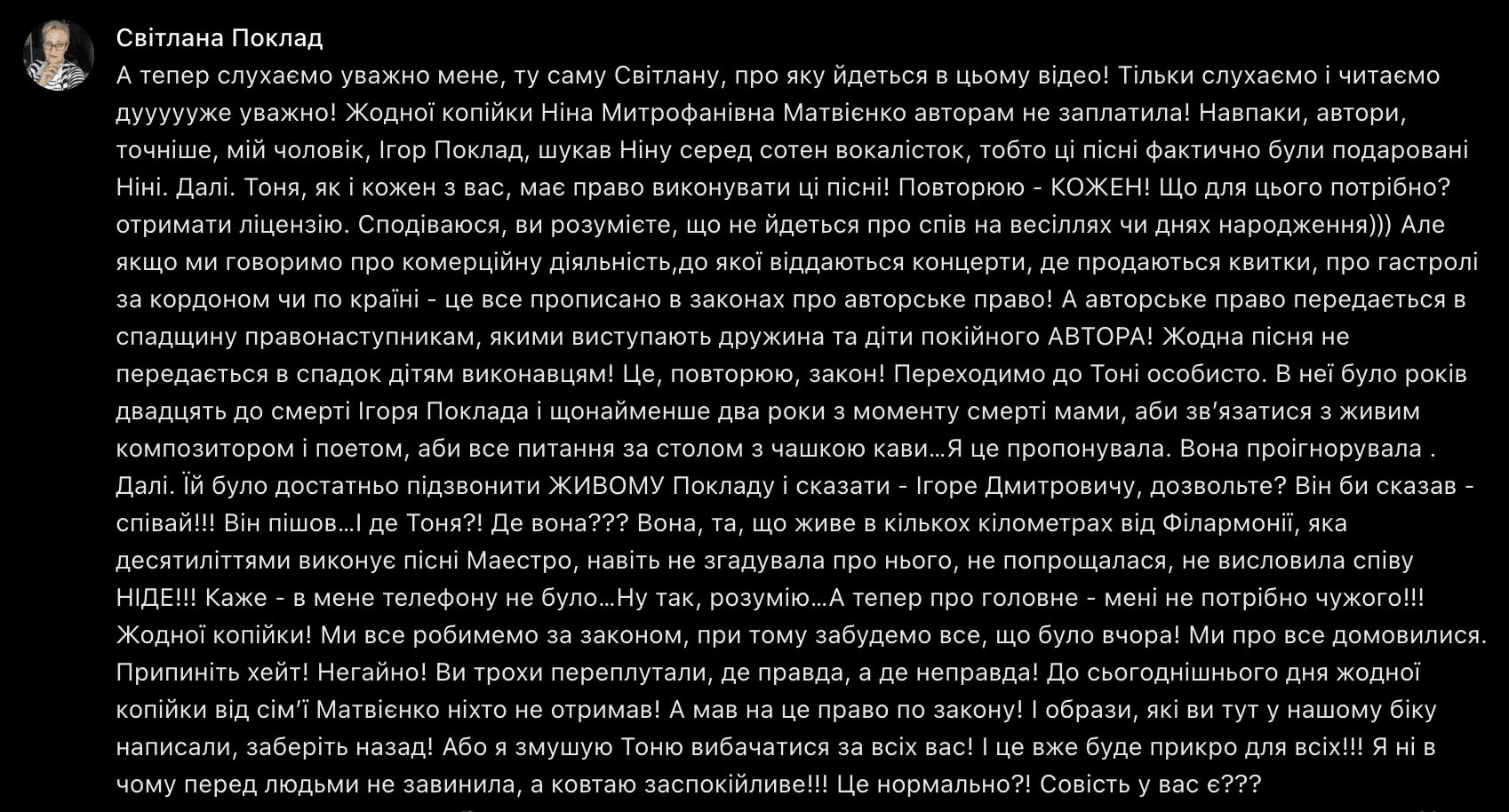 У своєму емоційному зверненні Світлана Поклад пояснила, що сім’я Матвієнко жодного разу не сплачувала авторські відрахування за виконання композицій Ігоря Поклада. Свого часу композитор дозволив Ніні Митрофанівні, матері Тоні, співати його пісні, проте права на ці твори залишалися за ним. Світлана наголосила, що хоча право на виконання пісень належить кожному, комерційне використання вимагає отримання відповідної ліцензії на пісні. Це ключовий аспект української музики та її правового регулювання.