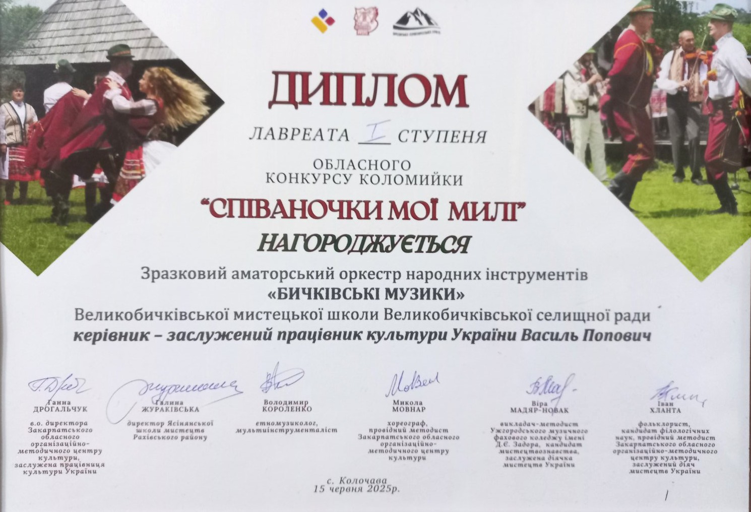 Серед учасників конкурсу був і Зразковий оркестр народних інструментів Великобичківської МШ під керівництвом Заслуженого працівника культури України Василя ПОПОВИЧА. Наш колектив юних музикантів, до складу якого входять скрипалі Лепай Дарія, Конюк Діана, Буценко Олексій, Ткач Іван, Березнай Наталія, Головчак Софія, Тимчак Аліна, Андрусяк Анастасія, Білан Мар’яна; акордеоністи Конюк Владислав, Ролюк Лев, Карабчук Михайло, баяніст Присакар Юрій, цимбаліст Чворсюк Іван, сопілкарка Дерда Олександра та ударник Грицак Марк, продемонстрував високий рівень майстерності та успішно впорався з усіма конкурсними вимогами. Важливу роль у підготовці до виступу відіграла викладачка закладу Ольга ПОПОВИЧ.