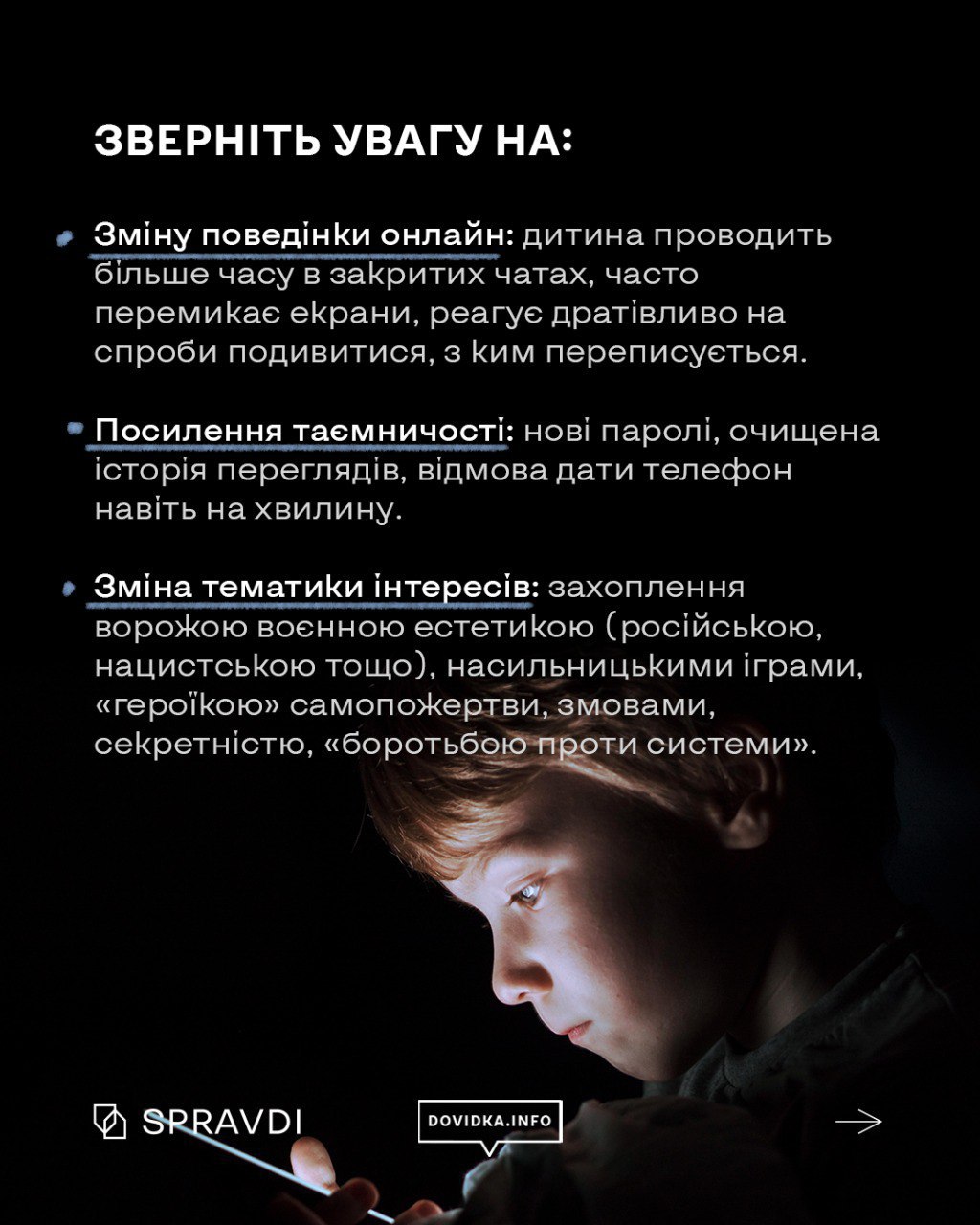 Більше про те, як розпізнати загрозу і на що звертати увагу в поведінці дитини – у графіці Центру та проєкту Dovidka.info 👇