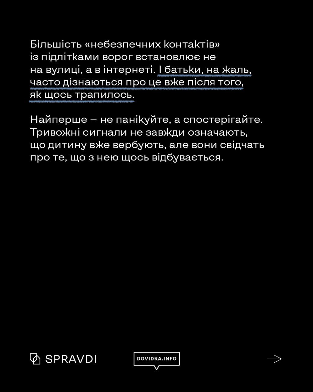 Щире батьківське спілкування з дитиною і пояснення усіх загроз вербування – найкраща профілактика непоправного.